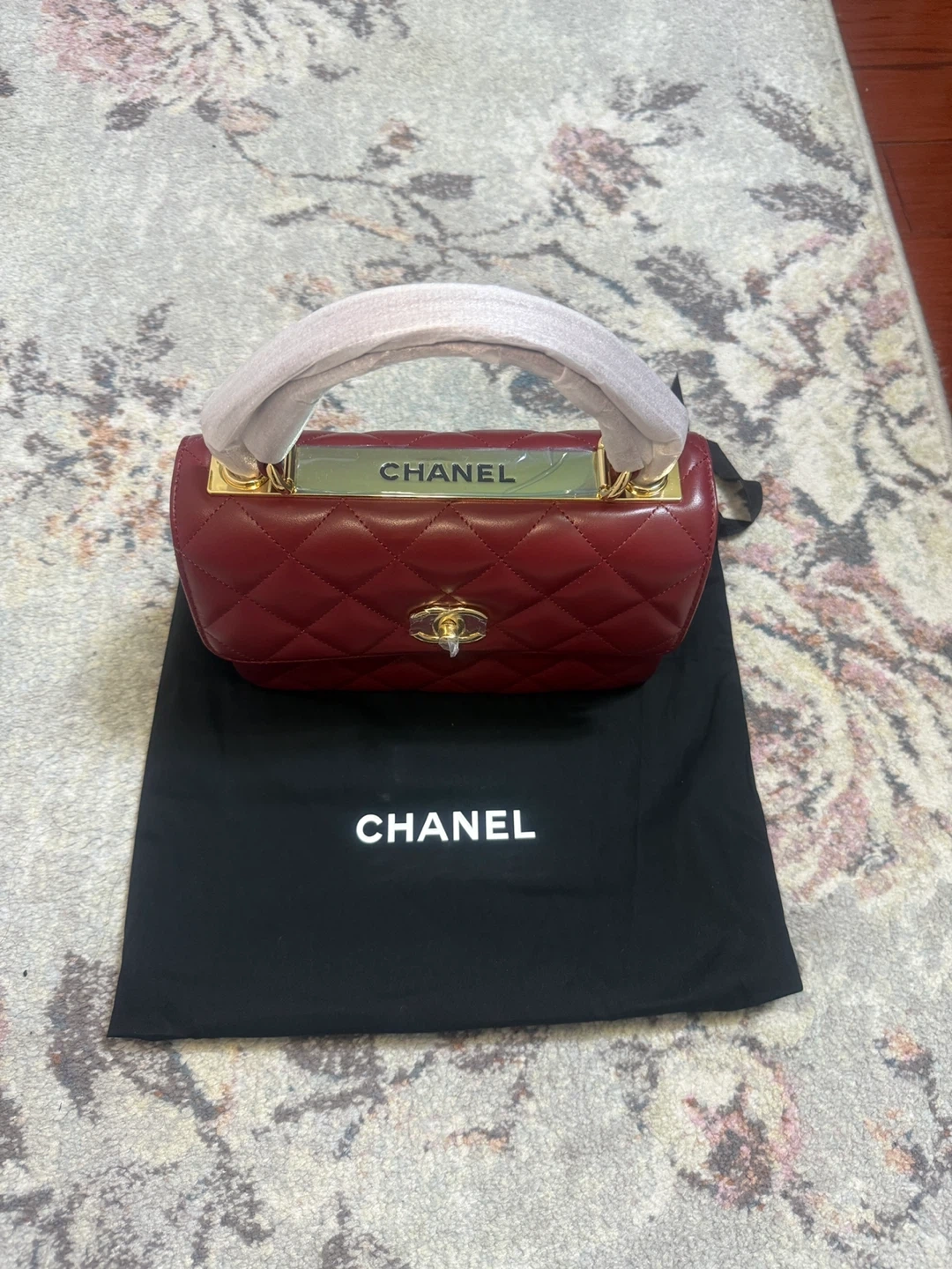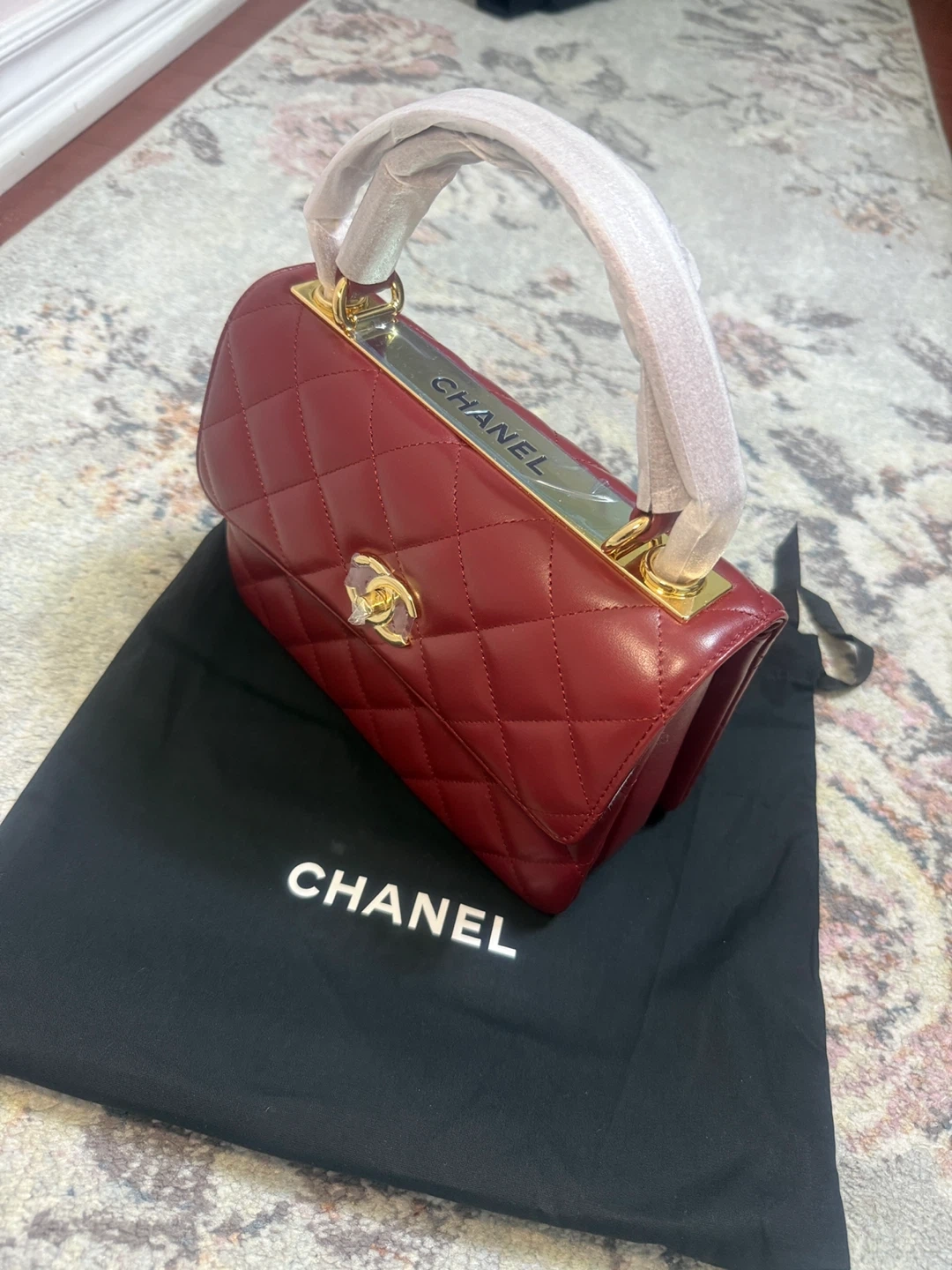 This is a stylish Chanel top handle bag in a deep red colour. It's made from quilted leather with gold-tone hardware. The bag includes its original Chanel dust bag. It's a sophisticated accessory for any occasion!