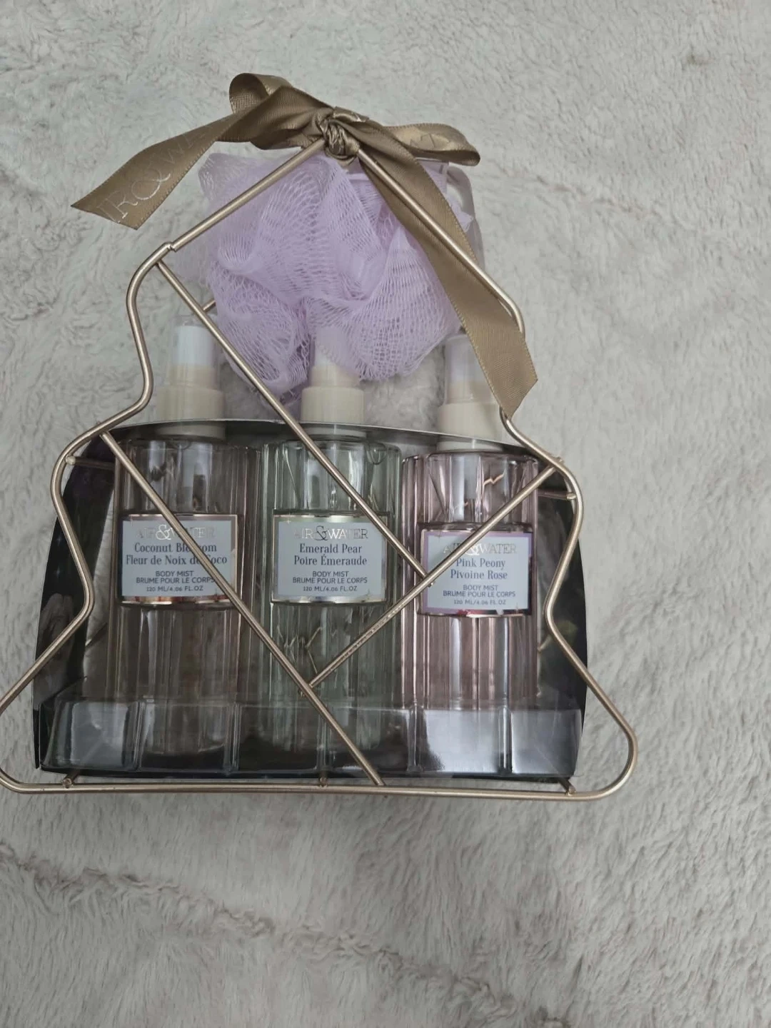 This is a set of three IR&WATER body mists in scents Coconut Bloom, Emerald Pear, and Pink Peony. Each mist is 120 ml (4.06 fl oz). A bath puff is also included.