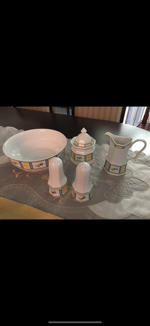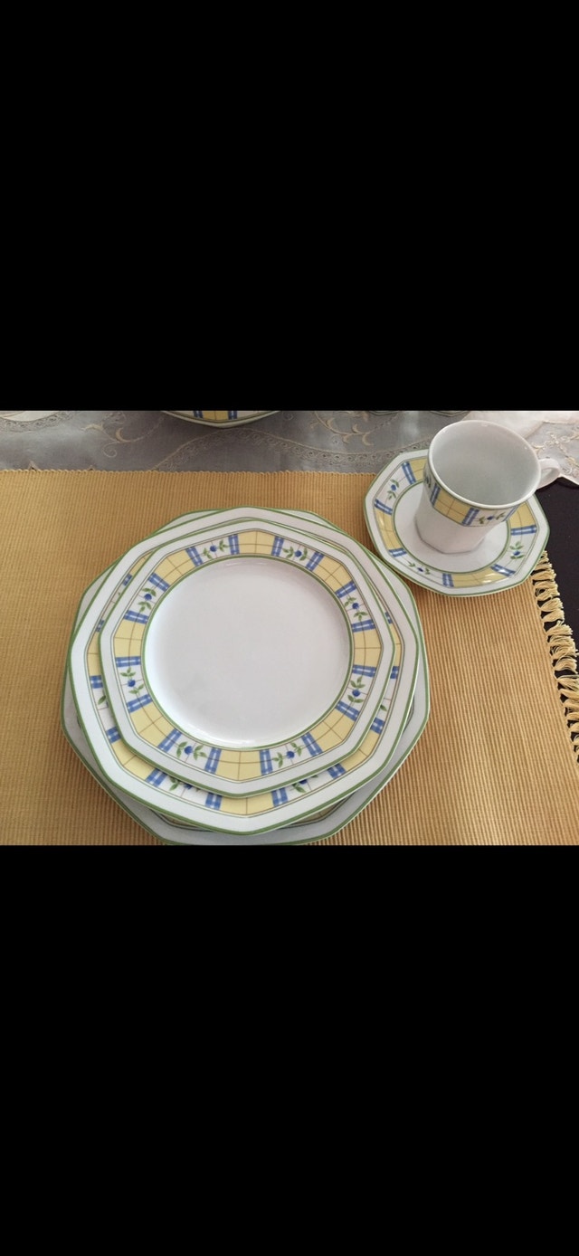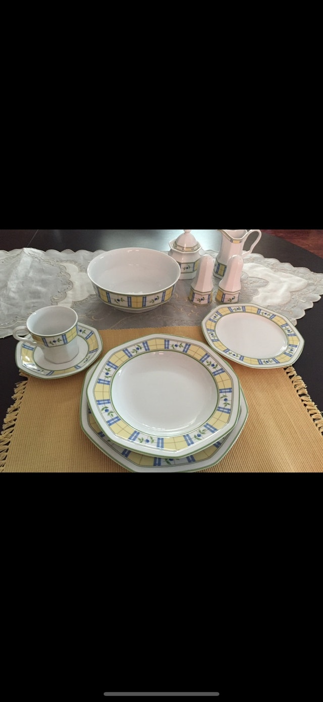 Service for 12 people - dinner plate, side/dessert plate, bowl, cup and saucer. 66 pieces including serving bowl, salt and pepper shakers, creamer and covered sugar bowl. Like new. No chips or cracks.