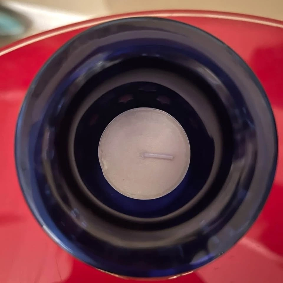 Beautiful PartyLite chrome and blue glass candle holder. When a tea light is lit inside, it shines stars throughout the room! It’s in perfect condition and discontinued!