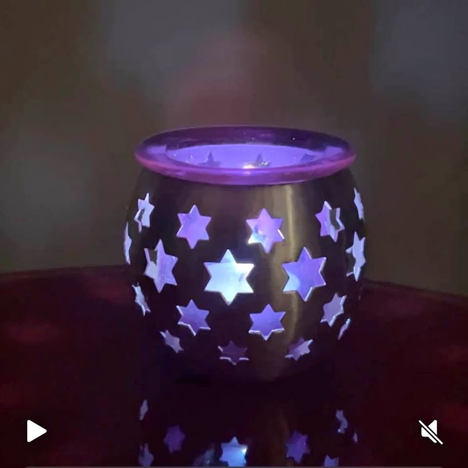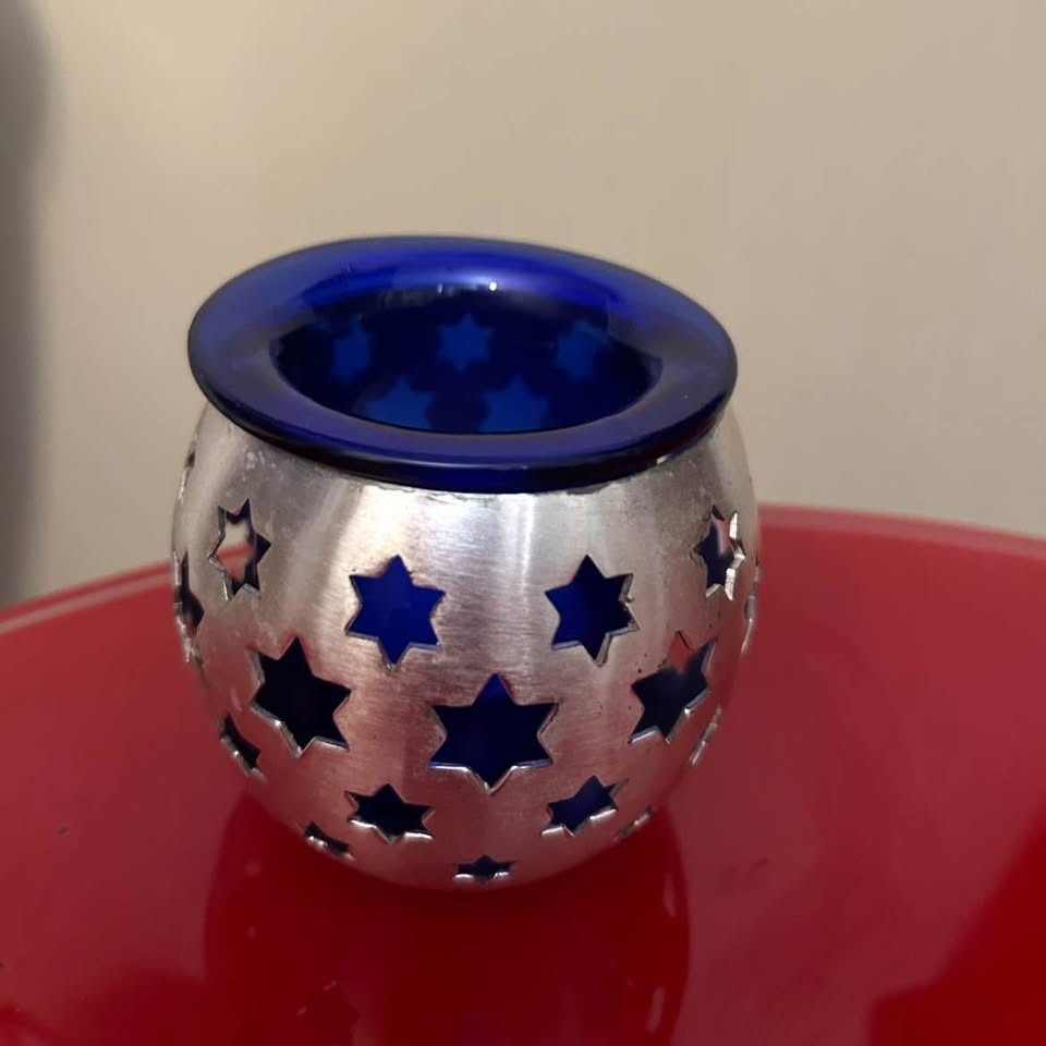 Beautiful PartyLite chrome and blue glass candle holder. When a tea light is lit inside, it shines stars throughout the room! It’s in perfect condition and discontinued!
