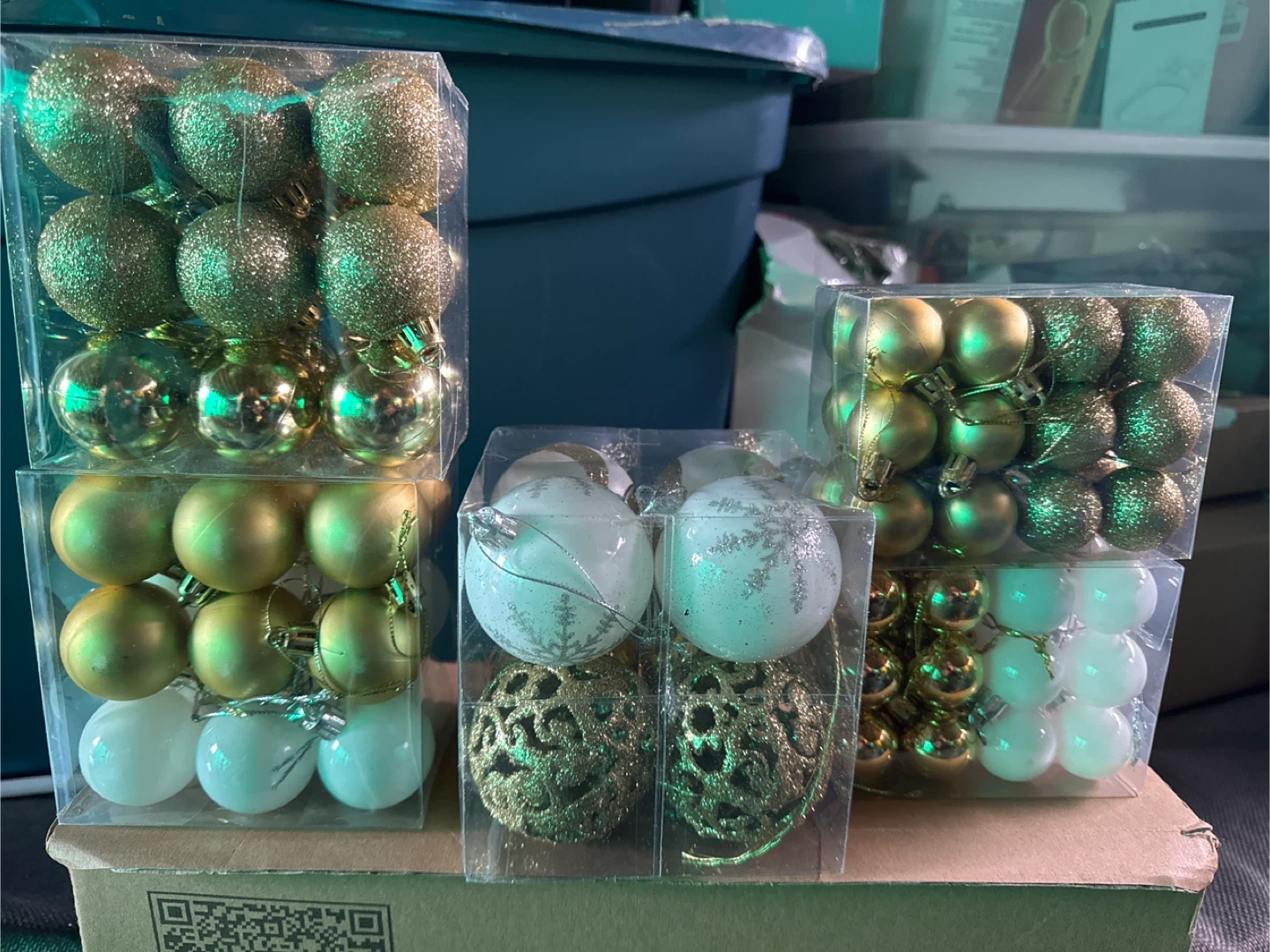 Selling a brand new set of DomeStar 100-pieces, Christmas ornaments! These are perfect for adding a touch of festive cheer to your home. The set includes a variety of gold and white ornaments in different styles and finishes. The original box is included