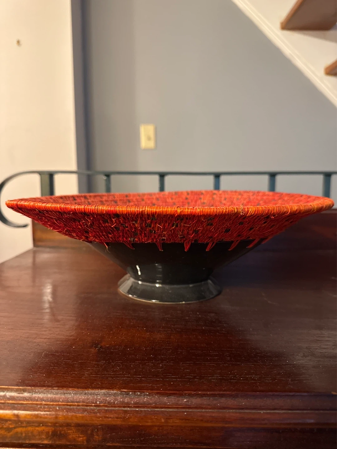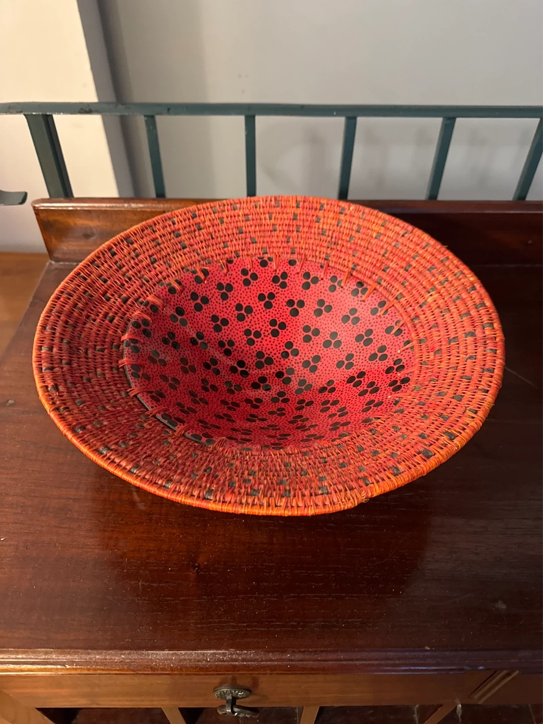 A stylish decorative red ceramic bowl with woven border featuring a spotted pattern. Its unique texture and vibrant colour make it a great accent piece for any room. I think my mom acquired it while living in South Africa.