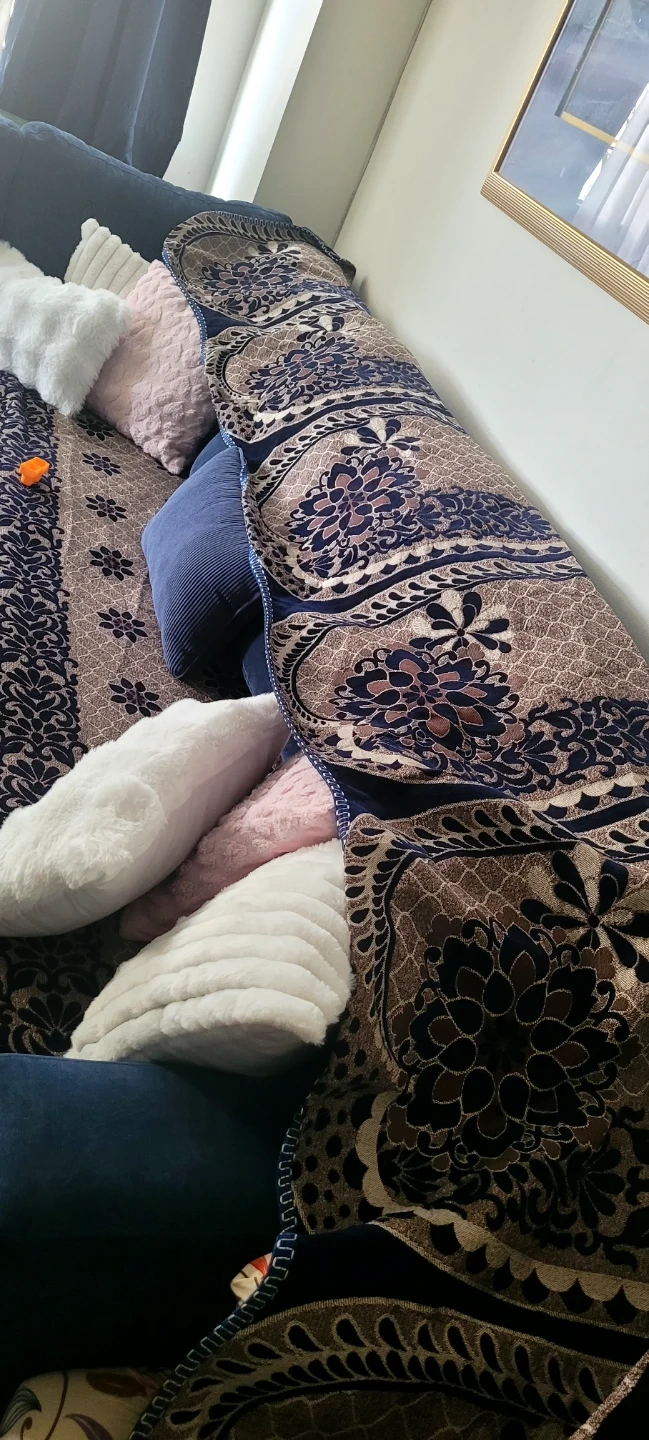 A decorative blanket or cover for your sofa. It features a rich, intricate floral pattern in navy blue, brown, and beige tones. Adds a touch of elegance and warmth to your living space!beck seat cover