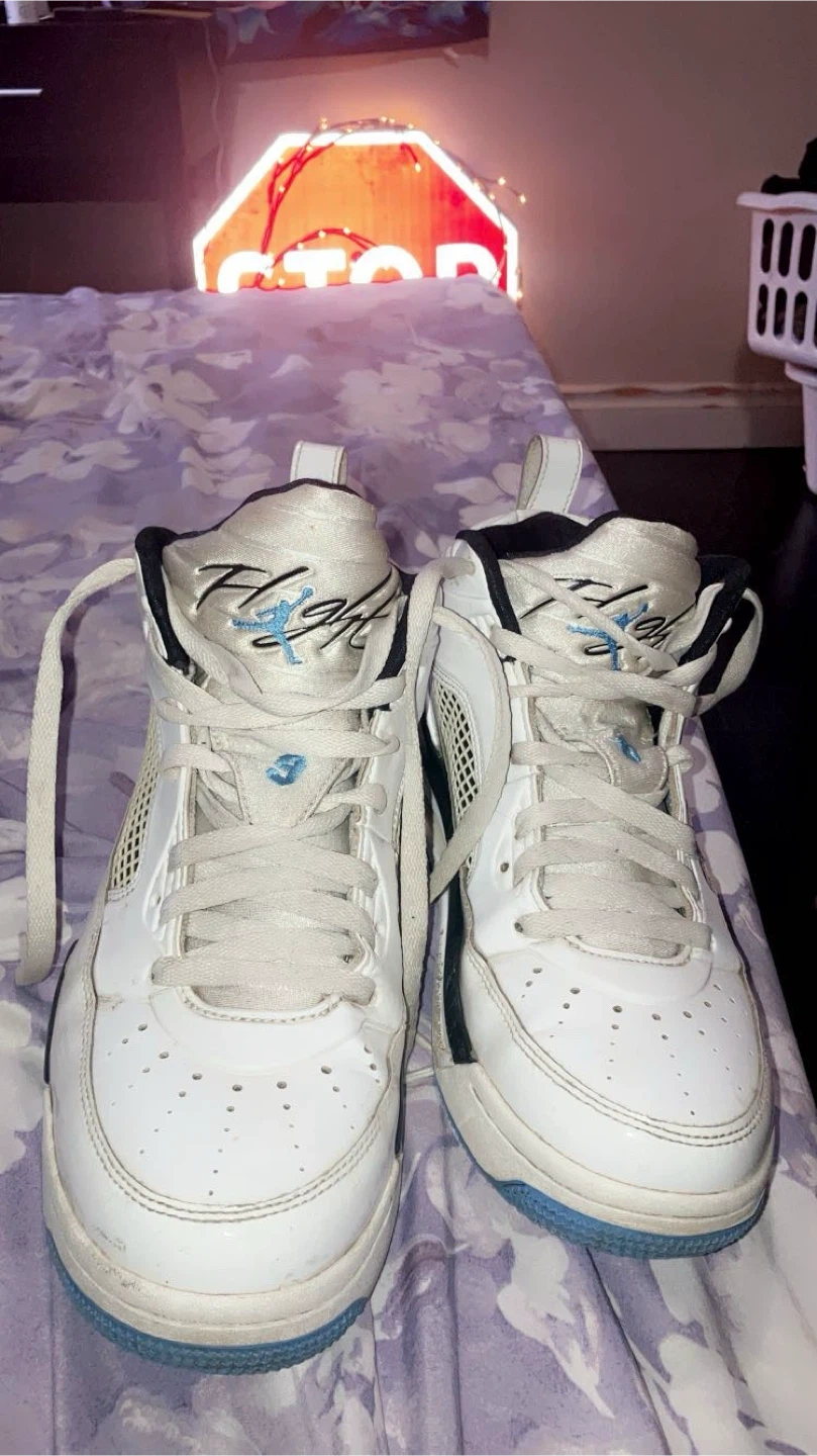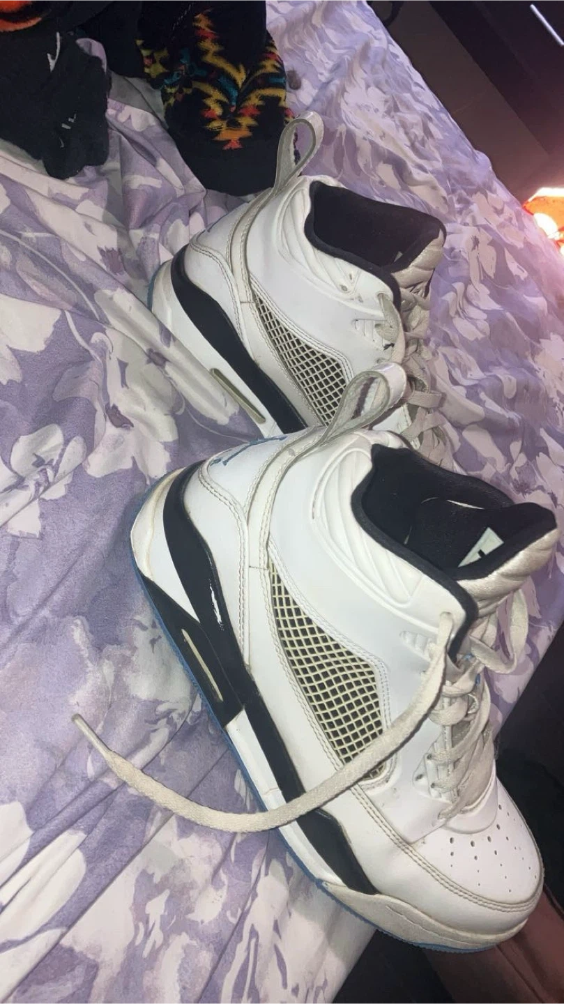 White and black Jordan Flight Club 91 high-top sneakers. Men's size 8. Includes original box. Made in China. Manufactured 09/09/15
