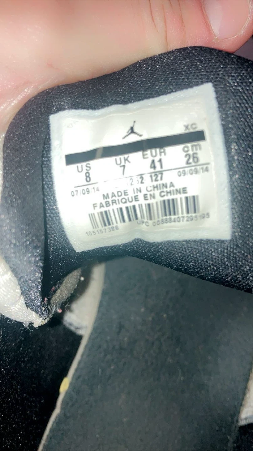 White and black Jordan Flight Club 91 high-top sneakers. Men's size 8. Includes original box. Made in China. Manufactured 09/09/15