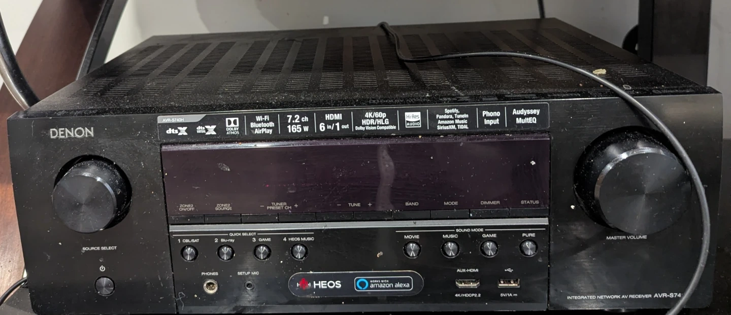 Denon AVR-S740H integrated network AV receiver with 7.2 channels and 165W per channel. It supports Wi-Fi, Bluetooth, AirPlay, Dolby Atmos, and 4K/60p HDR/HLG. Features Spotify, Pandora, Amazon Music, and Audyssey MultEQ. Includes a Phono input and HEOS multi-room audio.