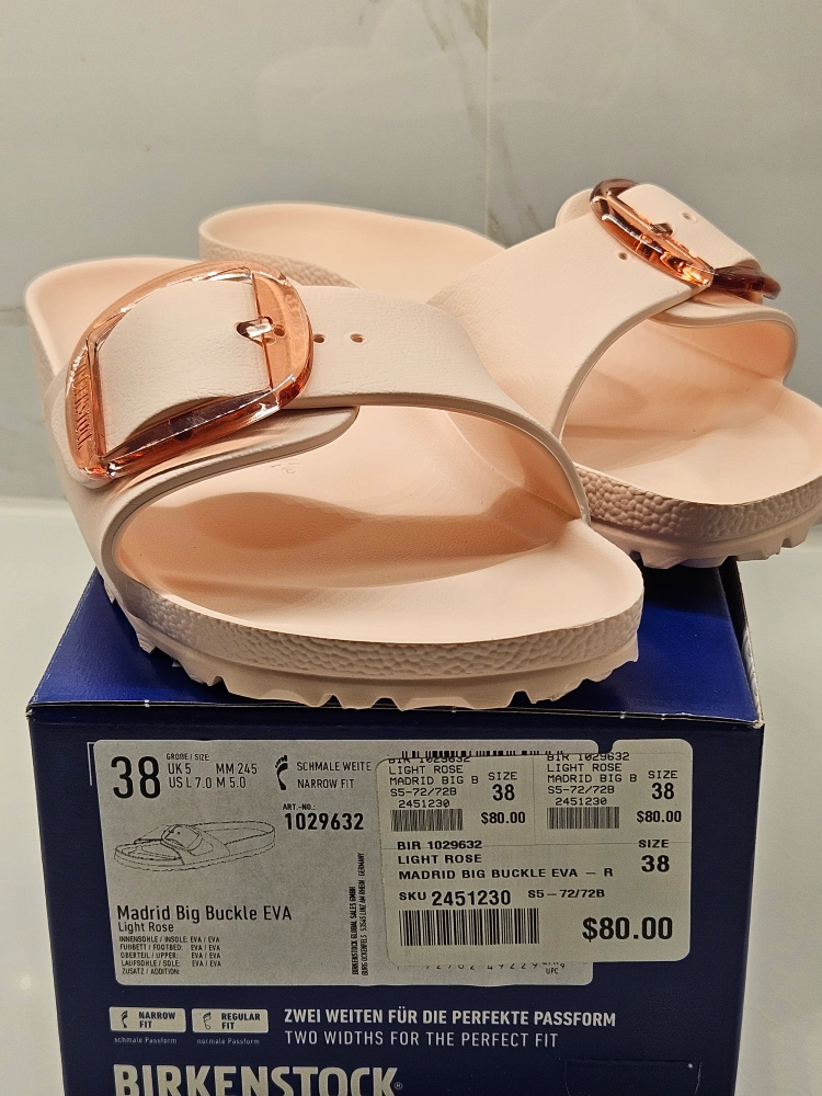 These Birkenstock Madrid Big Buckle EVA sandals are in light rose and size 38. They are brand new with the original box. The SKU is 2451230 and they retail for $80.