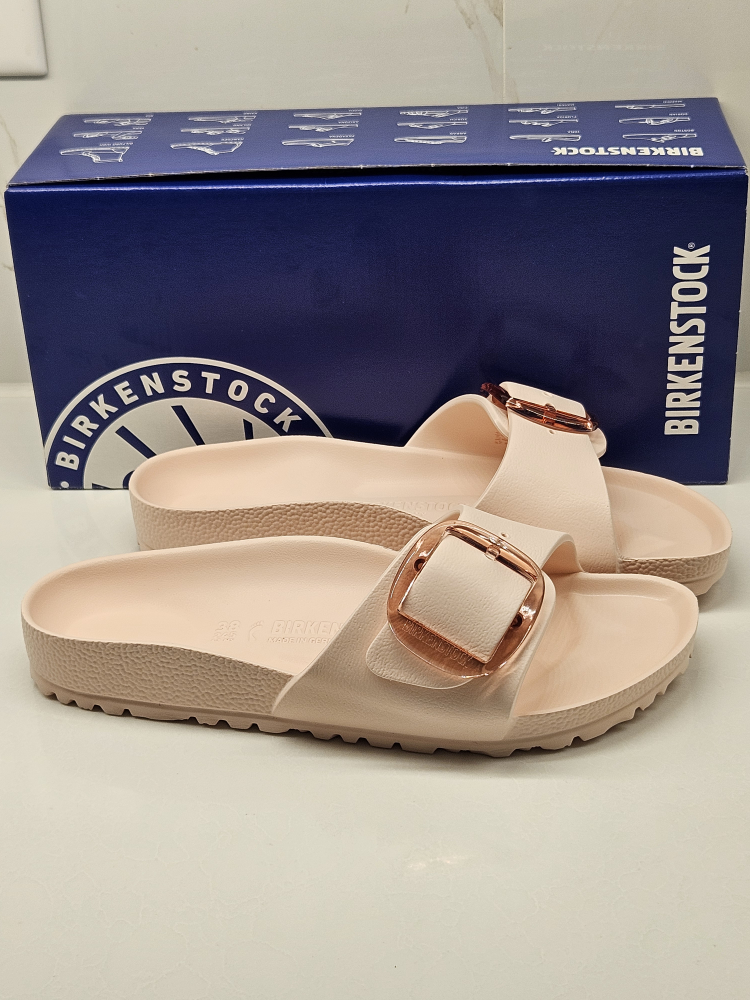These Birkenstock Madrid Big Buckle EVA sandals are in light rose and size 38. They are brand new with the original box. The SKU is 2451230 and they retail for $80.