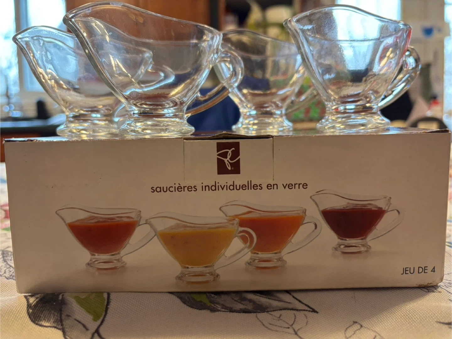 Selling two brand new sets of 4 President's Choice individual glass sauce boats (8 boats total)! They're perfect for serving gravy or dessert sauces at your next dinner party. The simple design complements any table décor, and they're dishwasher safe for easy cleanup. Each sauce boat has a capacity of 50 mL (1.75 fl oz). Includes the original box