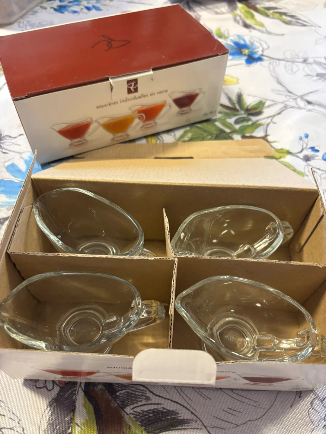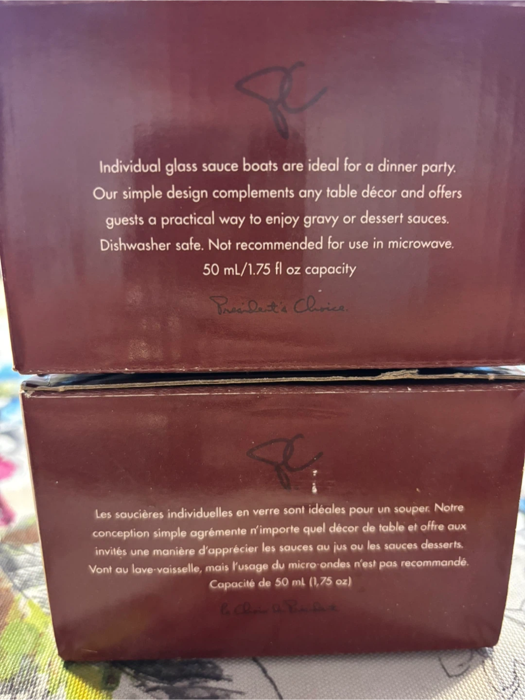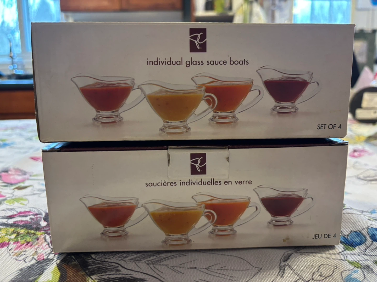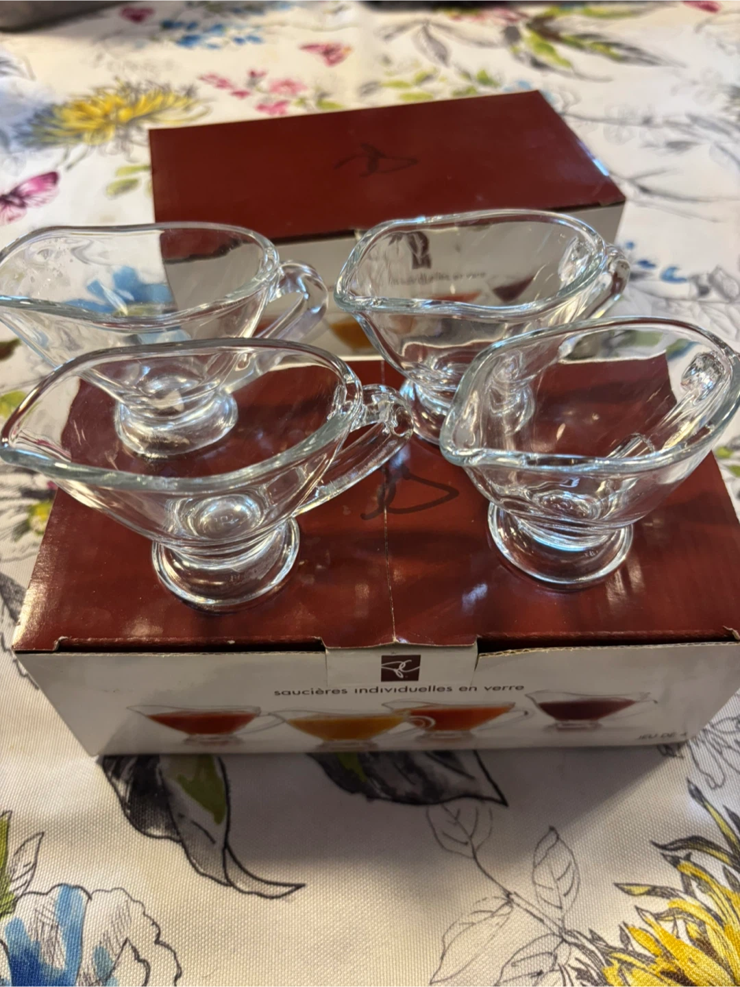 Selling two brand new sets of 4 President's Choice individual glass sauce boats (8 boats total)! They're perfect for serving gravy or dessert sauces at your next dinner party. The simple design complements any table décor, and they're dishwasher safe for easy cleanup. Each sauce boat has a capacity of 50 mL (1.75 fl oz). Includes the original box