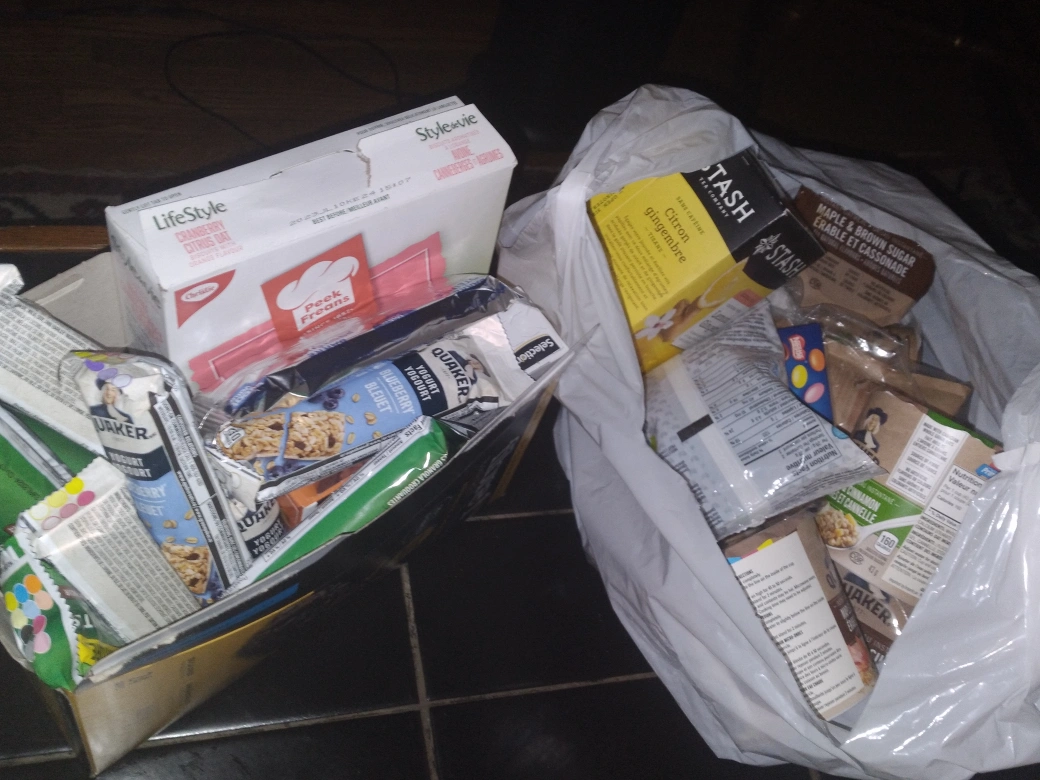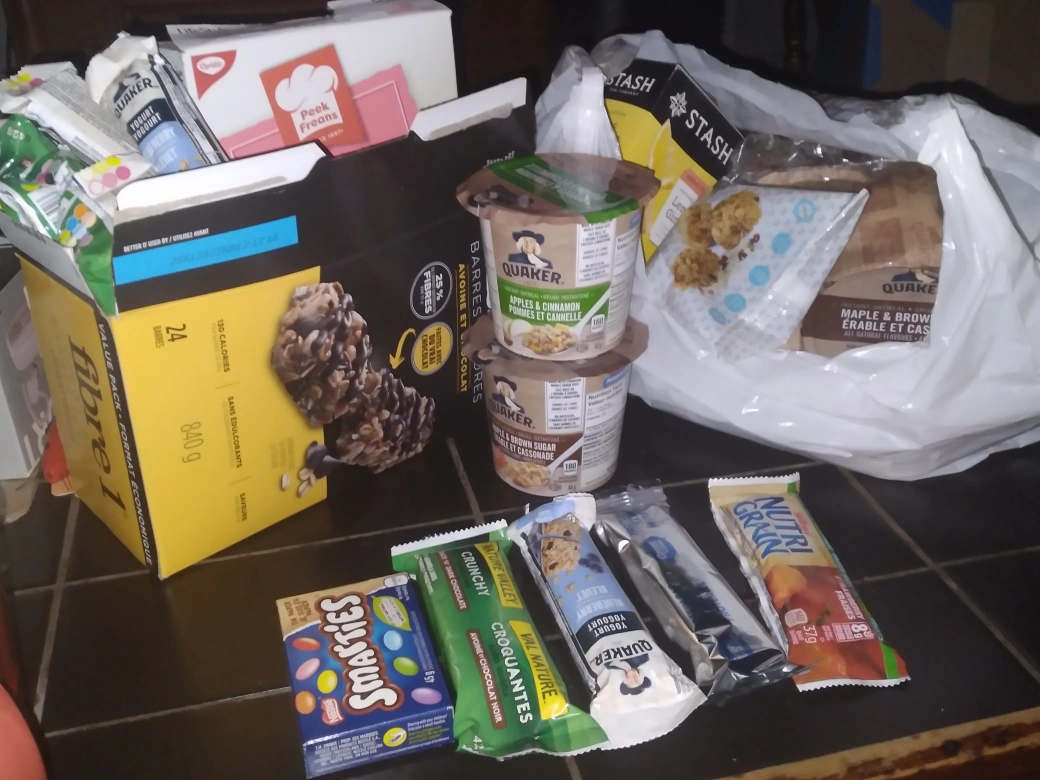 Box and bag of granola bars, like nutra grain, caramel nut, blueberry yogurt, chocolate, some cookies, lemon tea, smarties, clusters, etc. TAKE ALL.