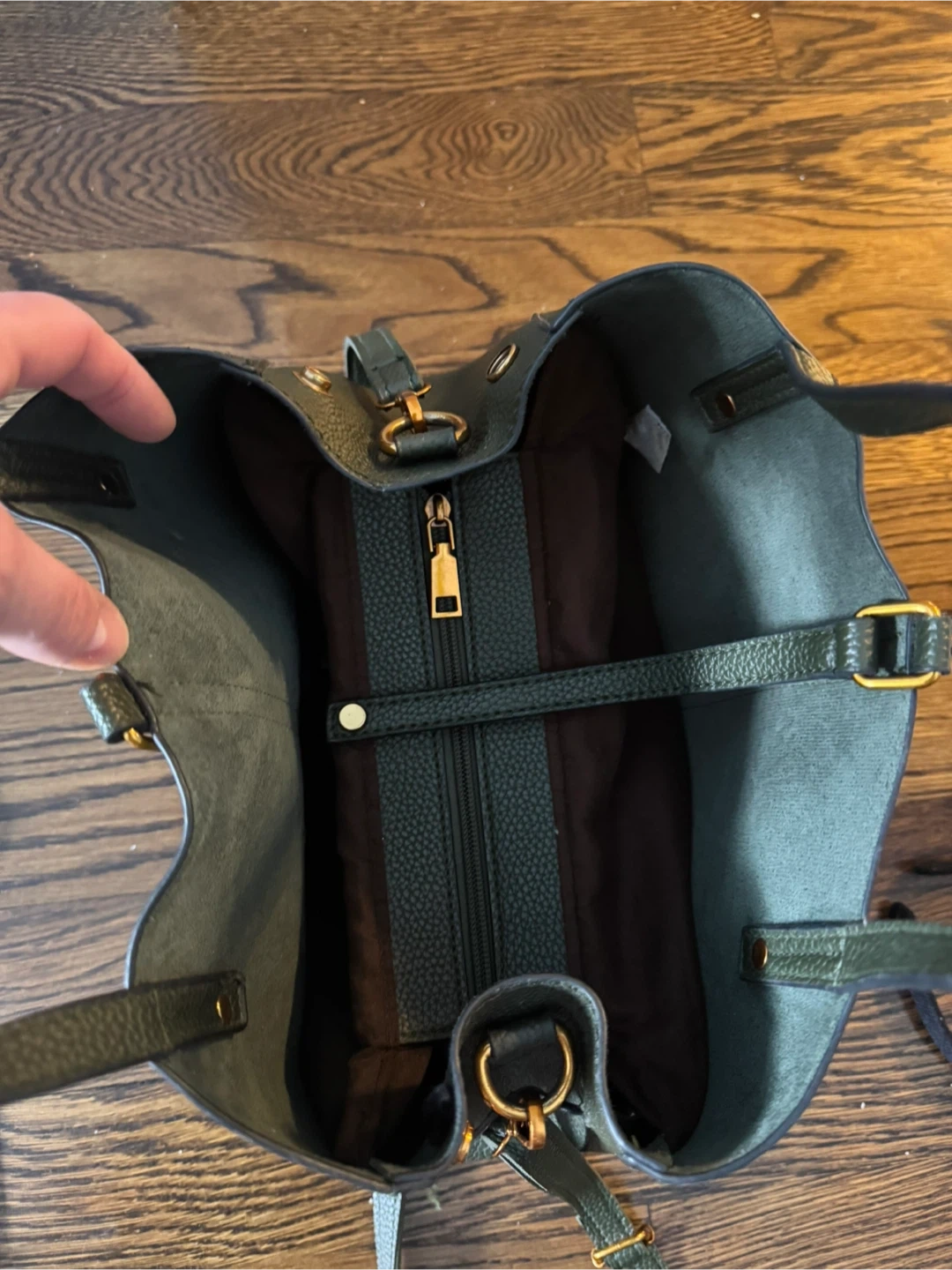 This dark green tote handbag is made from textured faux leather. It features a central zippered compartment and multiple carrying options with its top handles and adjustable shoulder strap. It's a versatile accessory for everyday use!