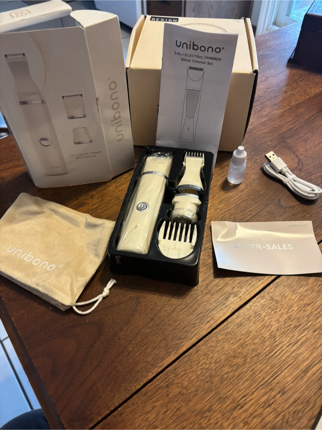 This Unibono 3-in-1 electric trimmer set is designed for bikini lines. It includes detachable heads for versatile grooming. The trimmer is ergonomically designed for comfortable use and supports wet & dry use. It features Type C charging. Brand new and never used, in original box and packaging. Cash only.