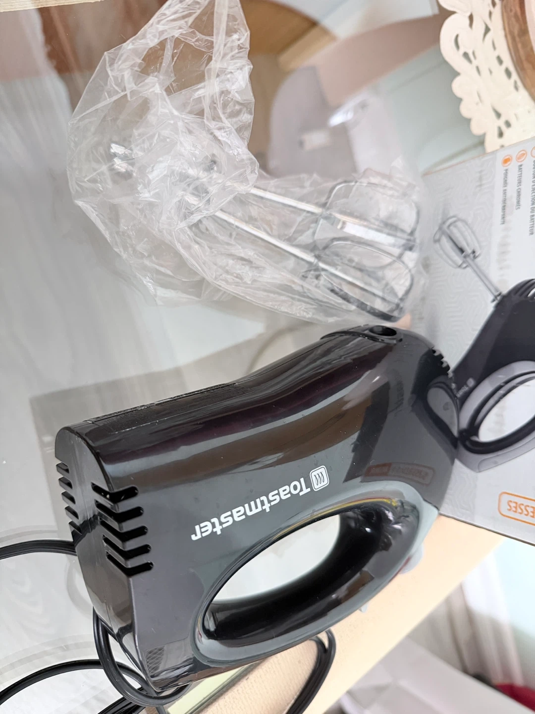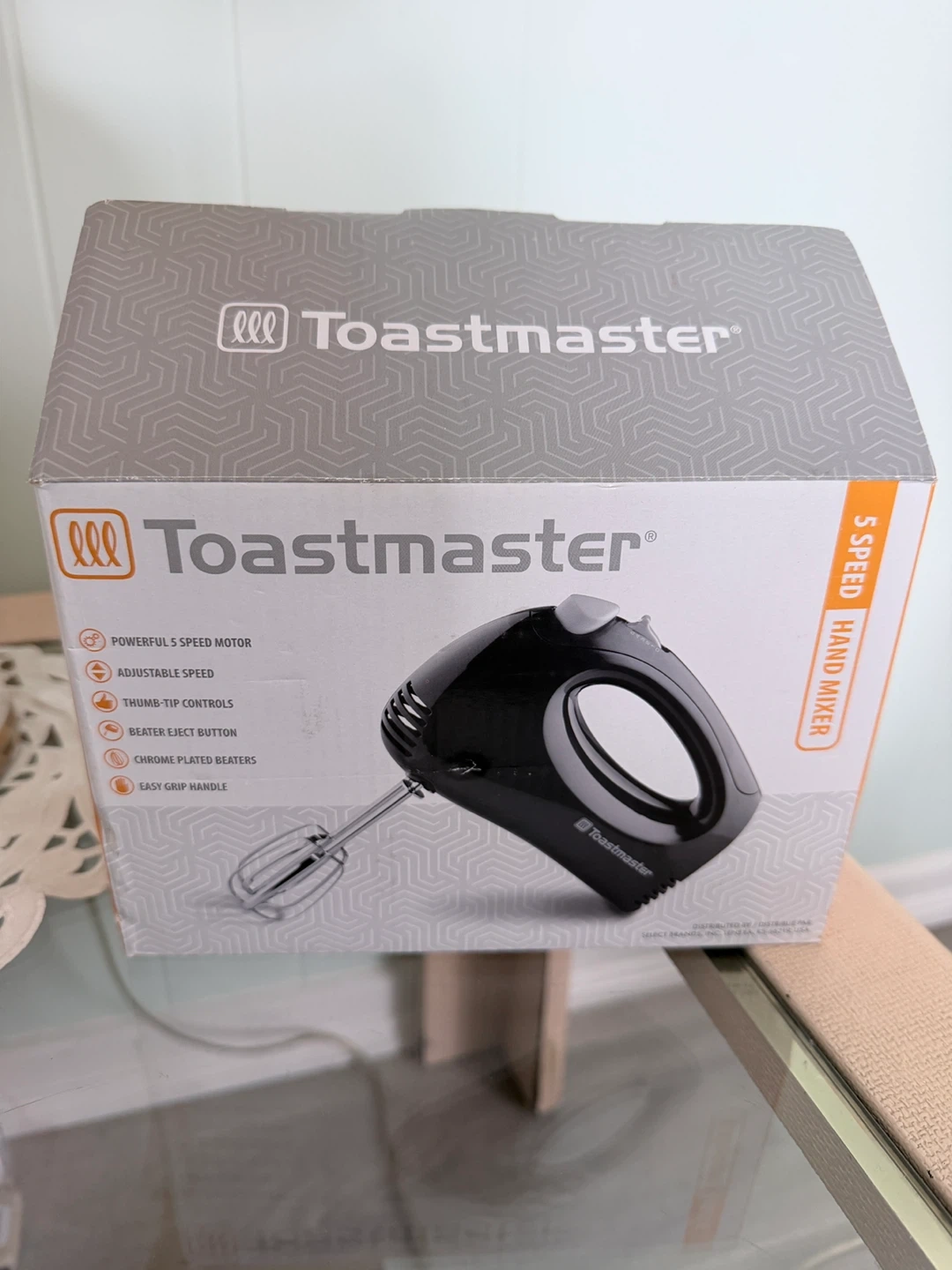 This is a Toastmaster 5 speed hand mixer. It comes with chrome plated beaters and thumb-tip controls. The mixer has a powerful 5 speed motor and an easy grip handle.