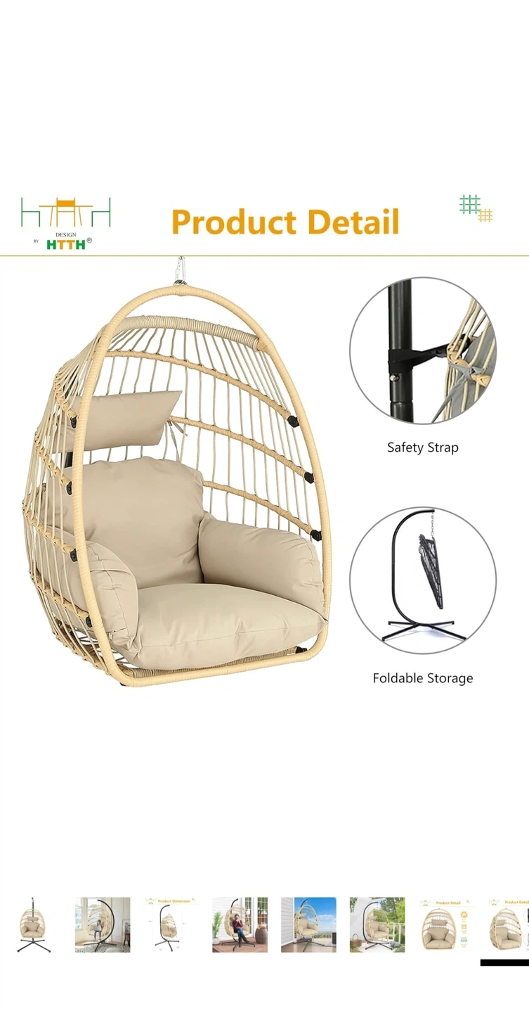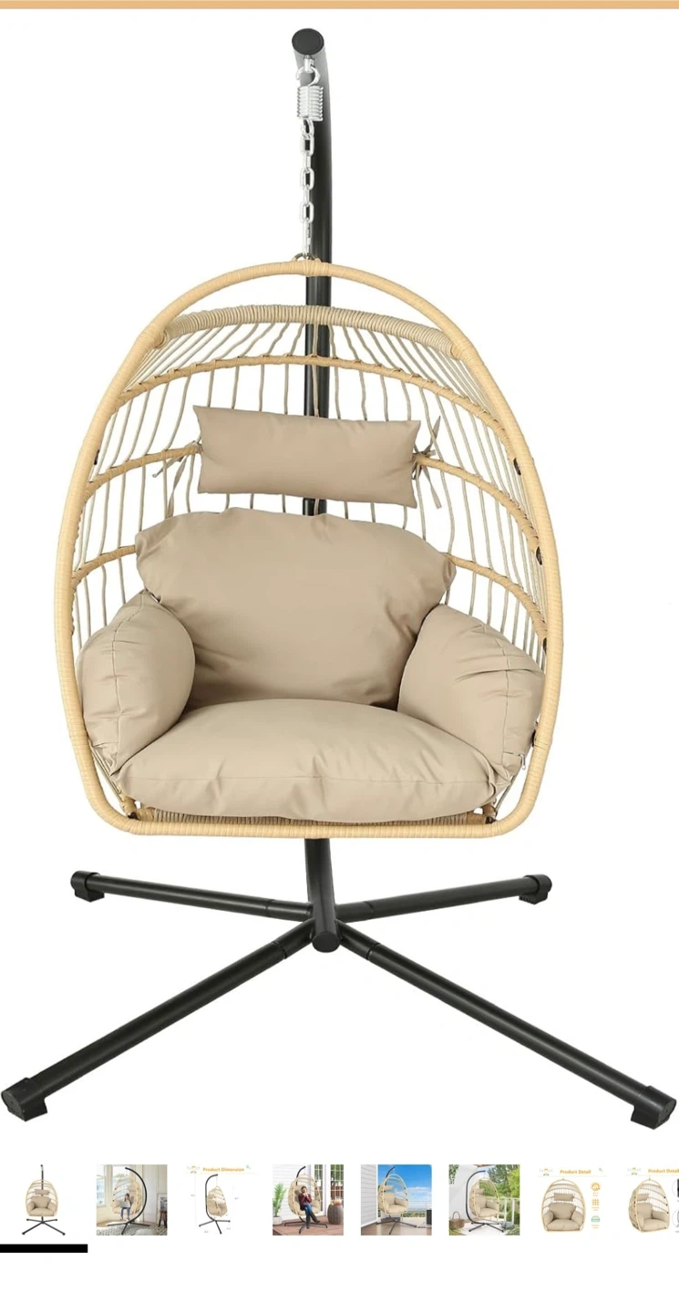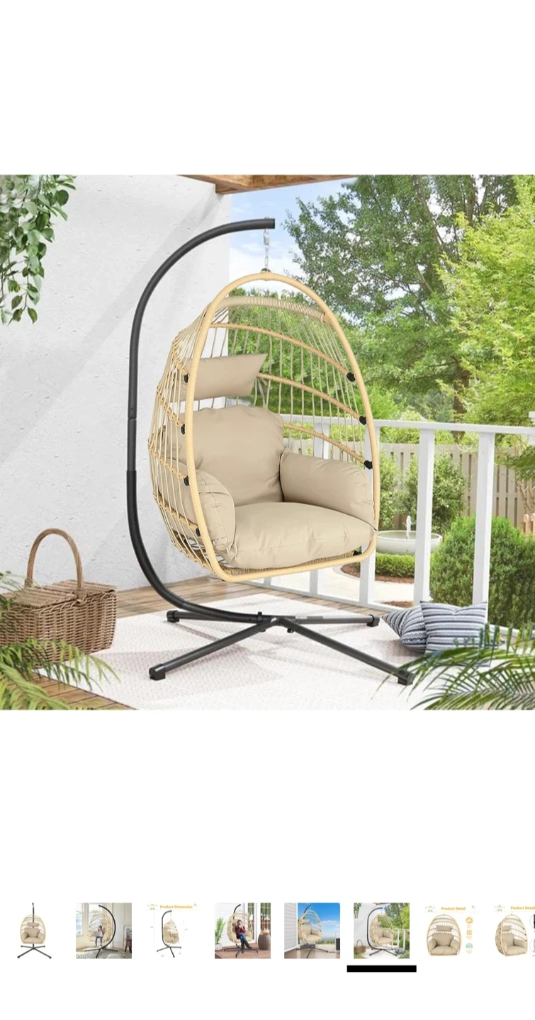 Wicker egg chair with a metal stand and beige cushion. Includes a safety strap and foldable storage. This chair is 79.5 inches tall and perfect for your patio or living room!