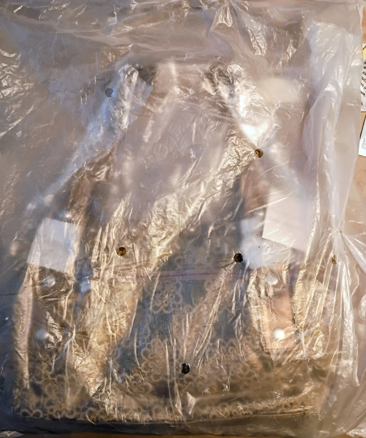 This is a gold-colored shoulder bag with a patterned design. It features a zippered top closure and decorative stud accents. The interior is lined.