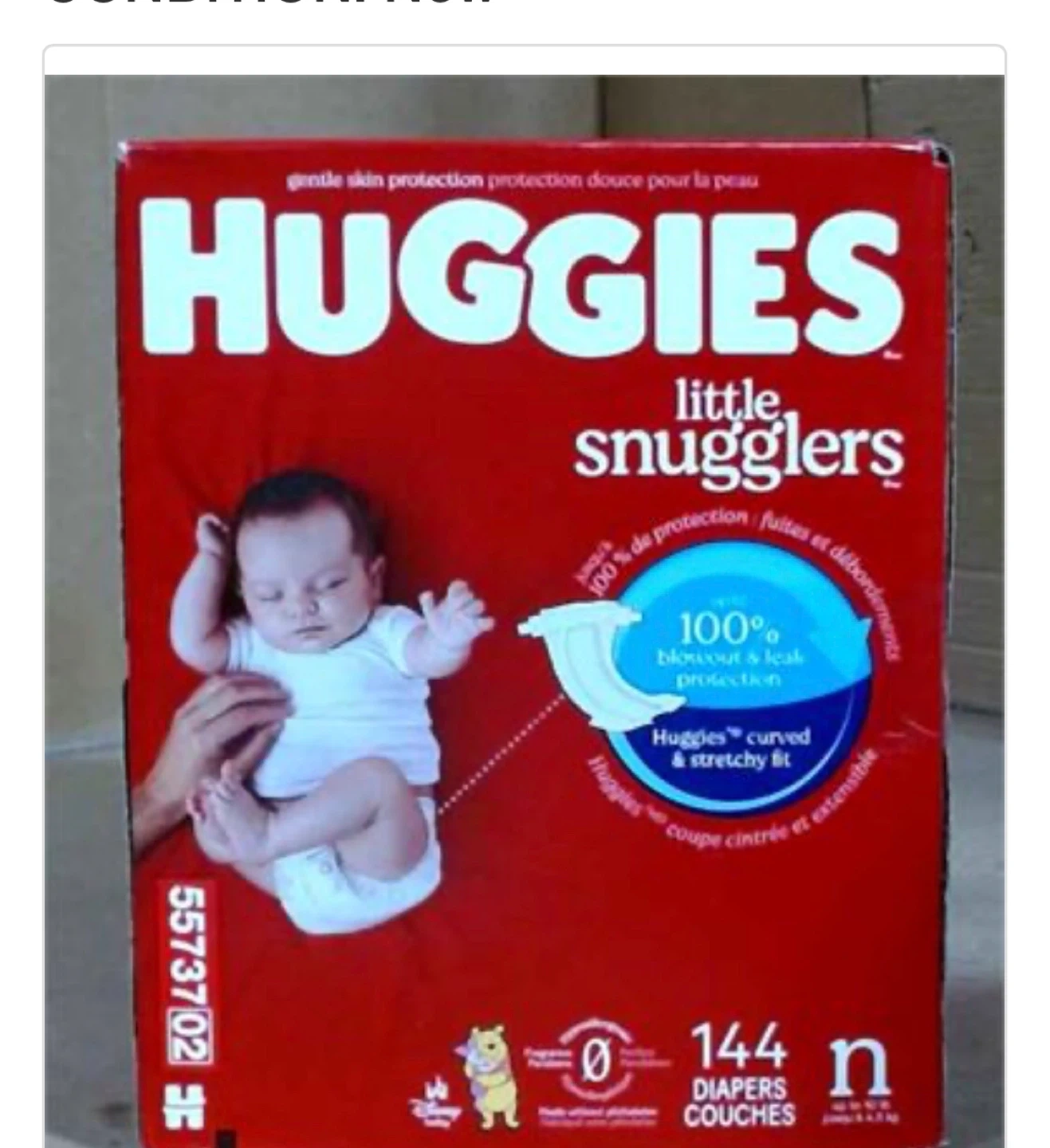 Huggies Little Snugglers diapers. These come in a pack of 144. They offer 100% blowout and leak protection with a curved and stretchy fit.