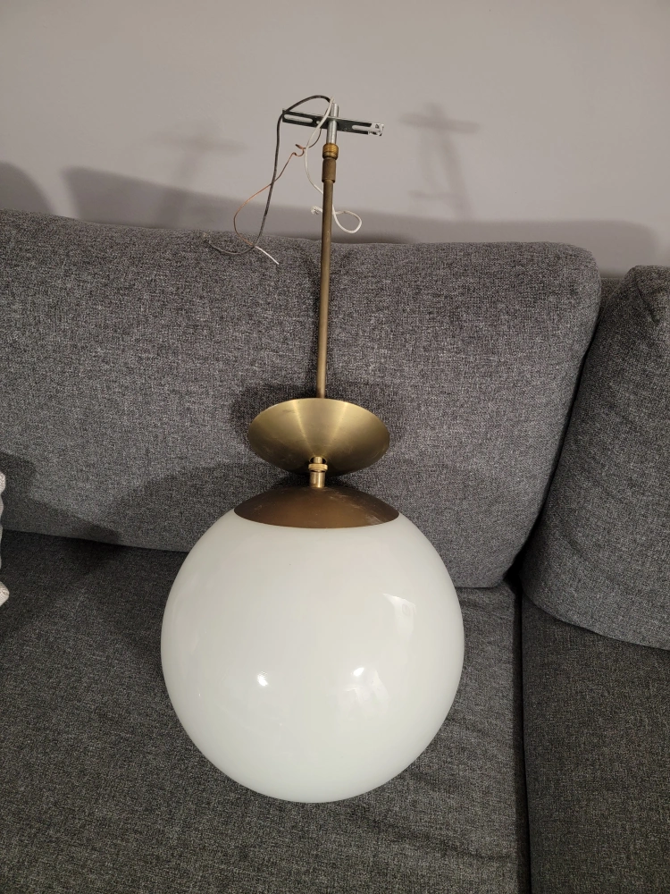 Selling a globe pendant light fixture. It's in great shape and would look lovely in any room! The globe is white, and the fixture has a brass finish. Perfect for adding a touch of modern elegance to your home.