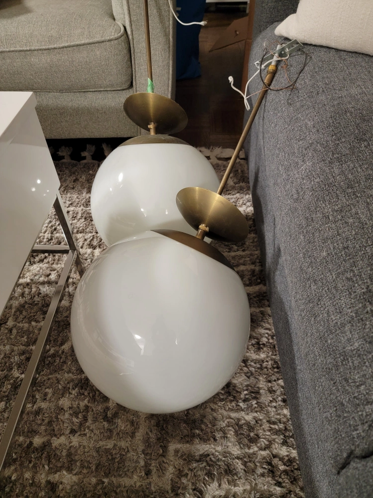 Selling a globe pendant light fixture. It's in great shape and would look lovely in any room! The globe is white, and the fixture has a brass finish. Perfect for adding a touch of modern elegance to your home.
