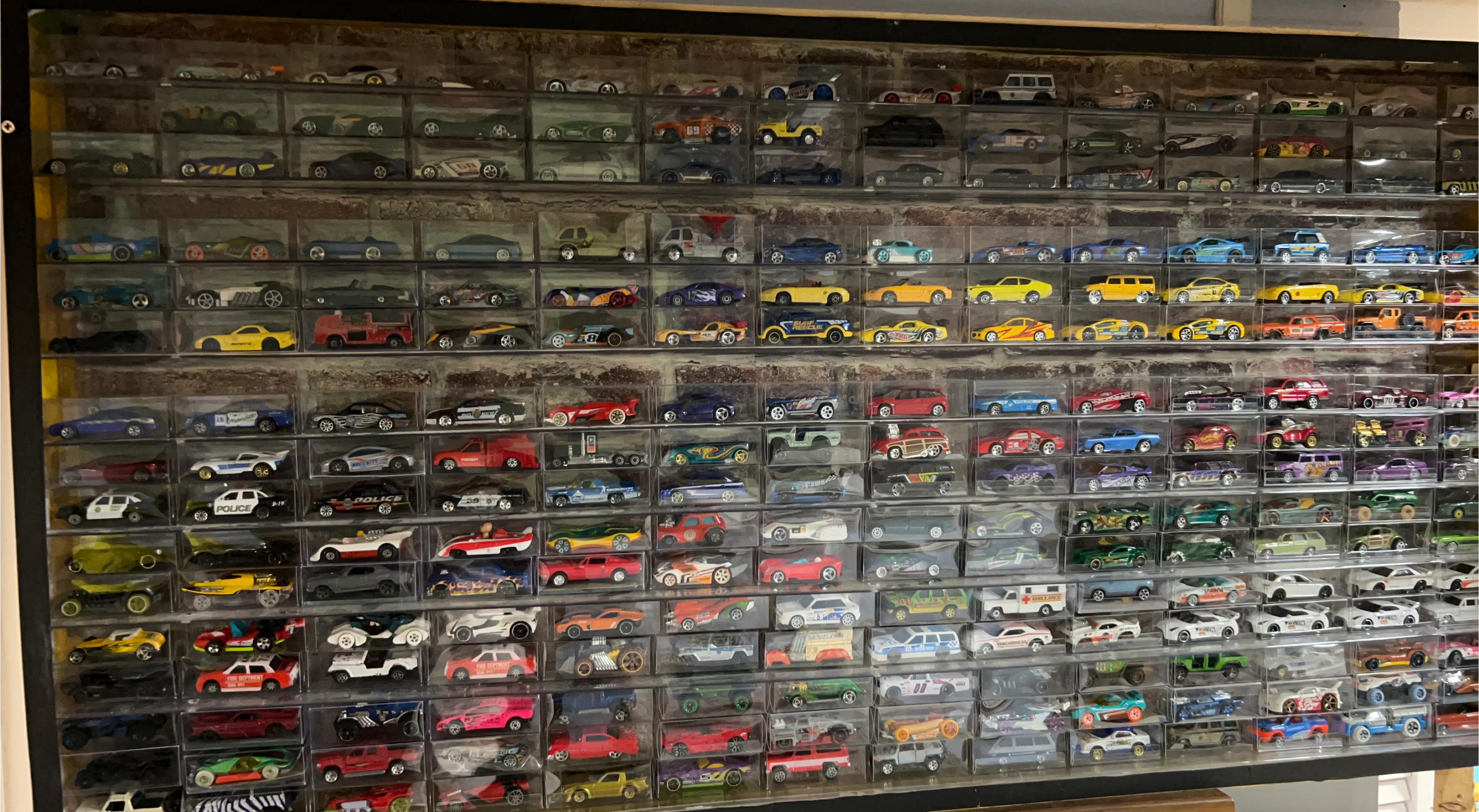 A large collection of Hot Wheels die-cast toy cars. Features a variety of models and colors. Perfect for collectors or for play!