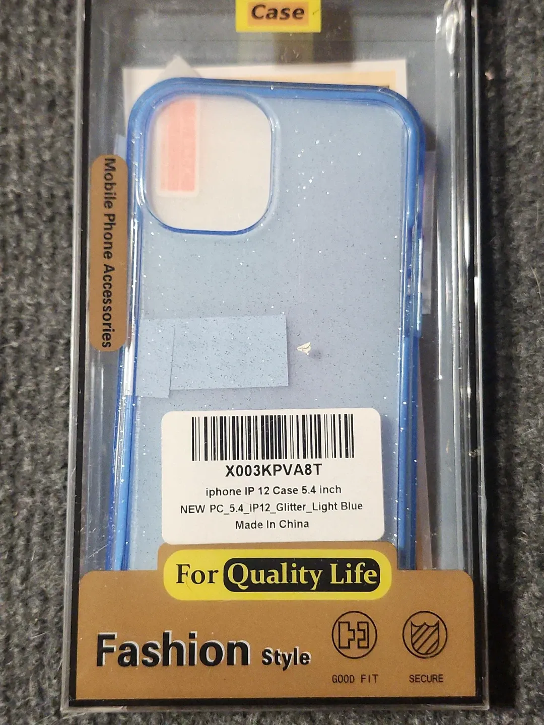 This is a light blue glitter case for an iPhone 12 5.4 inch. It's made from PC material. It provides good fit and security for your phone.