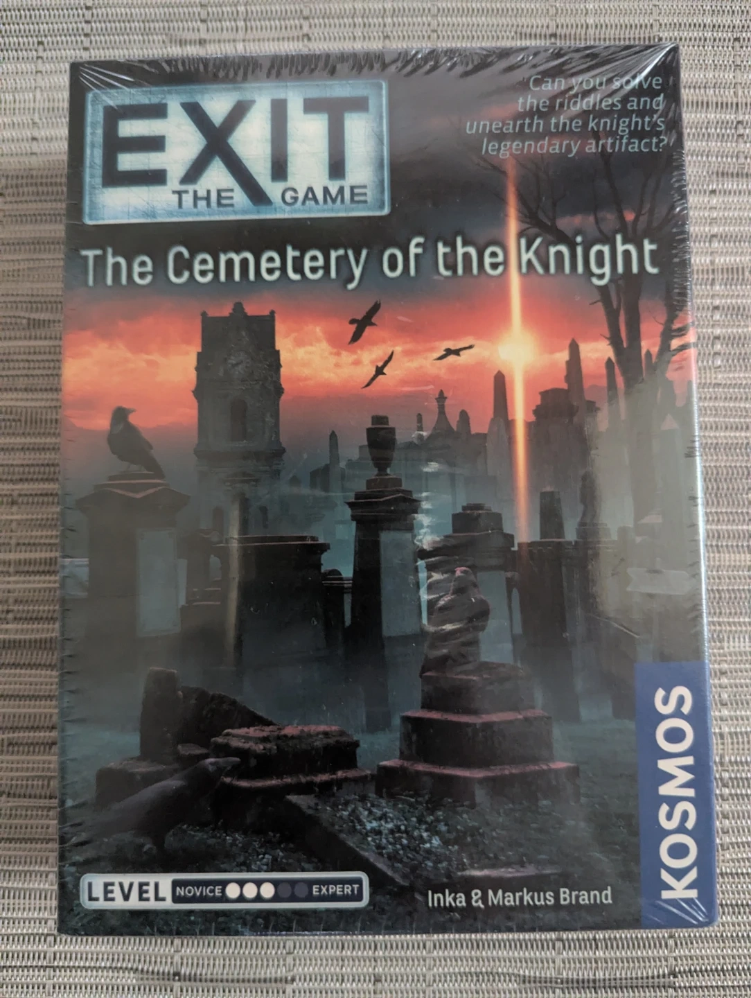 This is the EXIT: The Game - The Cemetery of the Knight board game. It's a cooperative escape room game for players to solve riddles. The game features a novice level difficulty. New unopened.