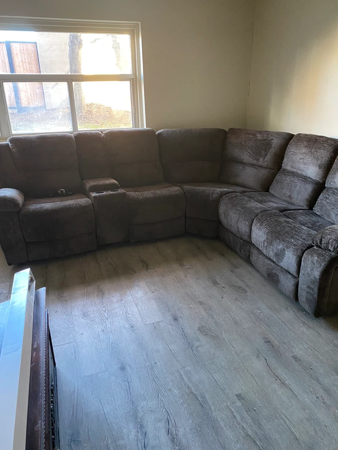 Spacious dark grey sectional sofa with reclining seats and a built-in cup holder console. Upholstered in a soft, textured fabric. It's a comfortable and functional addition to any living room.