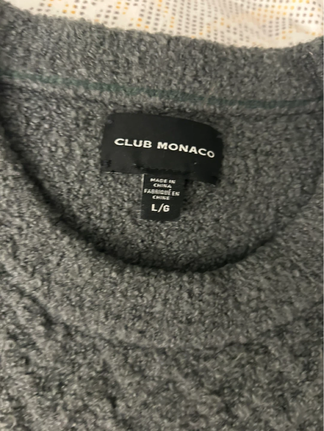 This Club Monaco sweater comes in a versatile dark green colour with a unique boucle textured knit pattern. It's a size large/g. This knit is perfect for layering when the weather cools down!