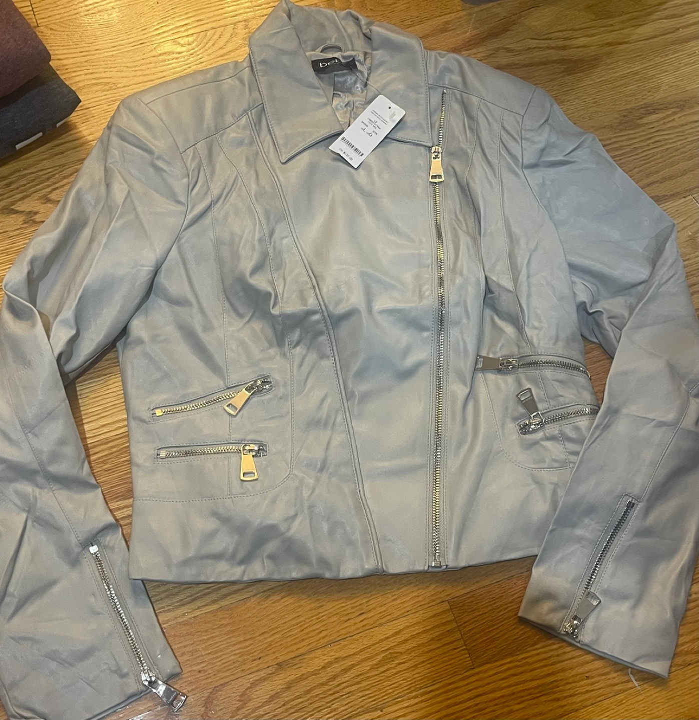 Beige faux leather moto jacket. Has multiple zippered pockets. Size Large. Bebe. Brand new with tags
