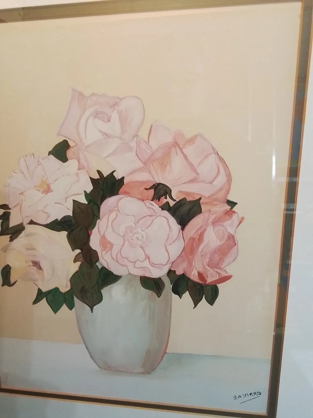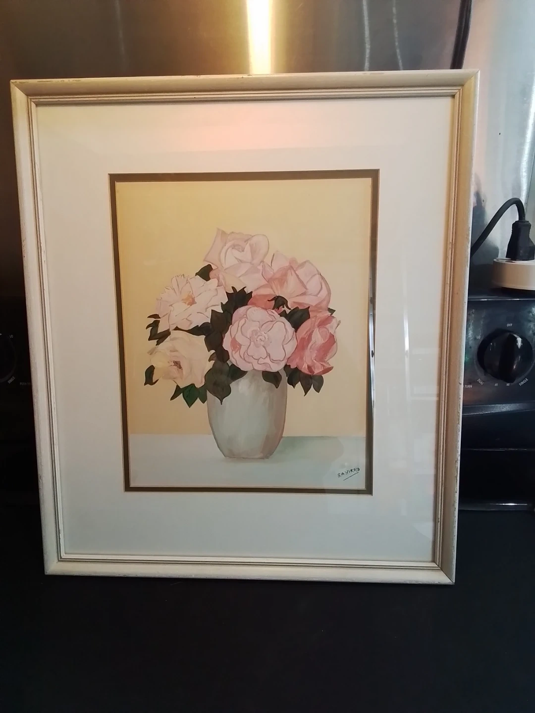 Framed painting of pink and white roses in a vase. The artwork is signed by S.A. Virro. It's ready to hang and would brighten up any room!
