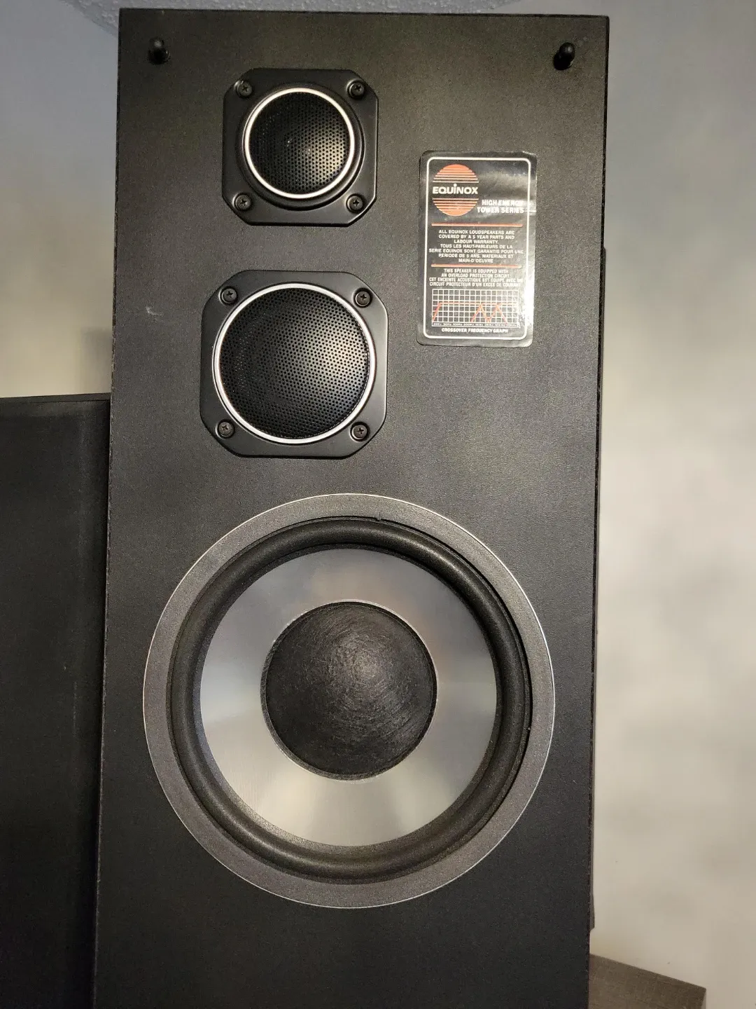 Equinox speaker from the High Energy Tower Series. It has an overload protection circuit for safety. This speaker would be useful for anyone looking to set up a home audio system.
