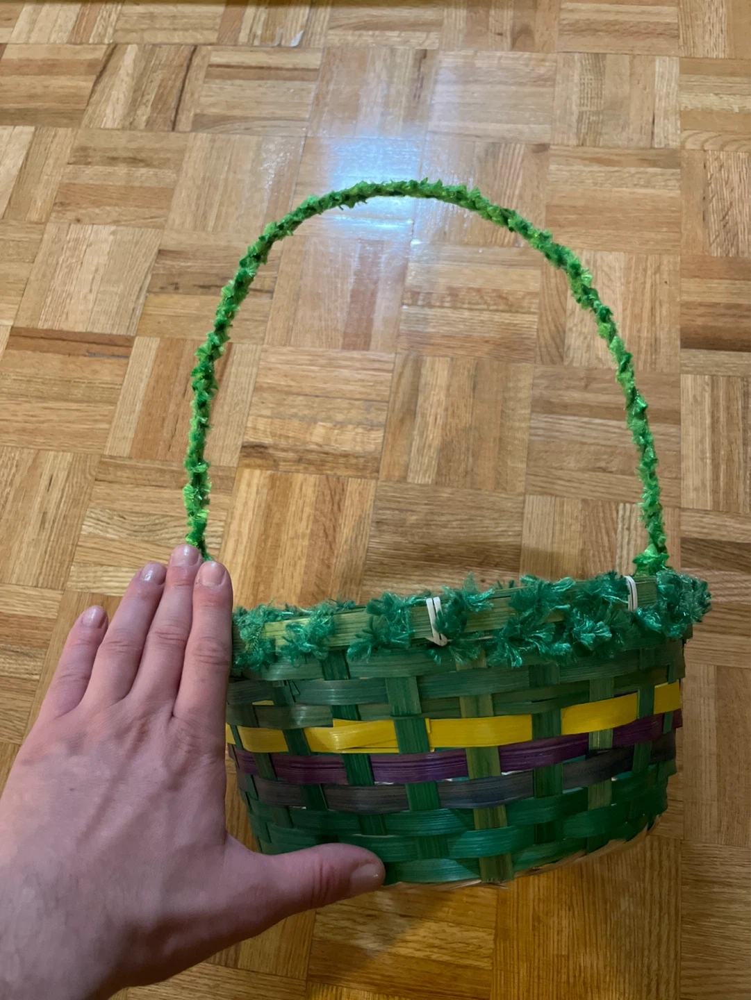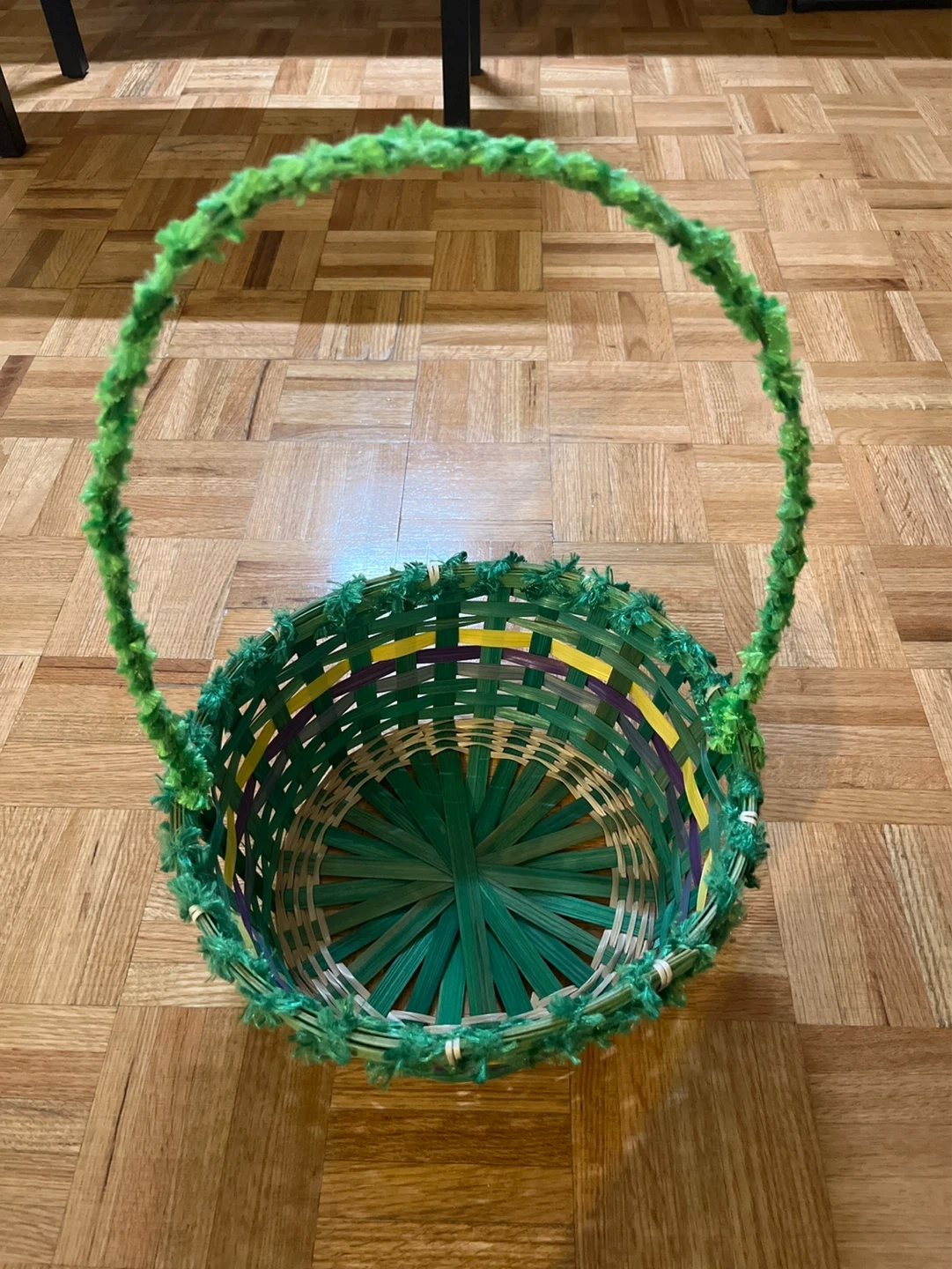This decorative basket is woven from natural materials with green, yellow, and purple accents. It features a fluffy green trim around the rim and a matching green pipe cleaner handle. It's perfect for Easter egg hunts or holding small gifts!