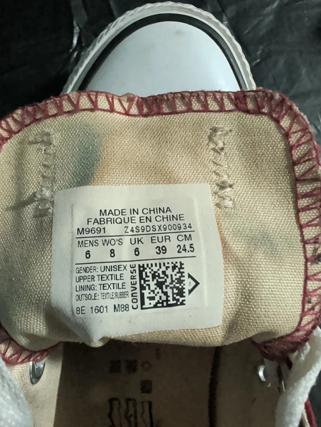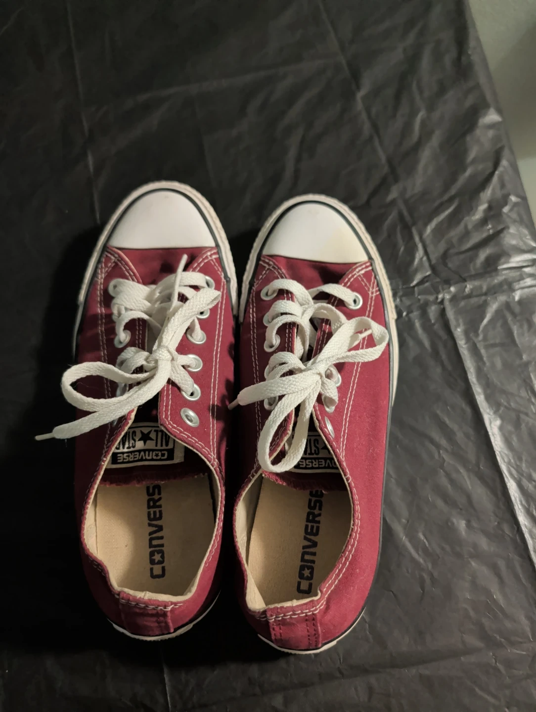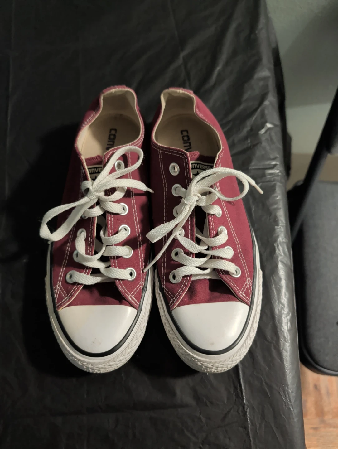 Burgundy converse Chuck Taylor All Stars. Low top. Men's US size 6 / Women's US size 8. Textile upper and lining with rubber outsole.