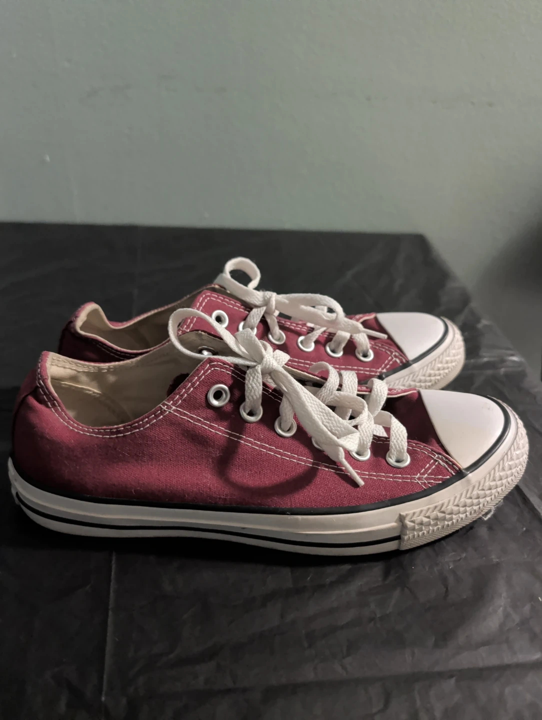 Burgundy converse Chuck Taylor All Stars. Low top. Men's US size 6 / Women's US size 8. Textile upper and lining with rubber outsole.