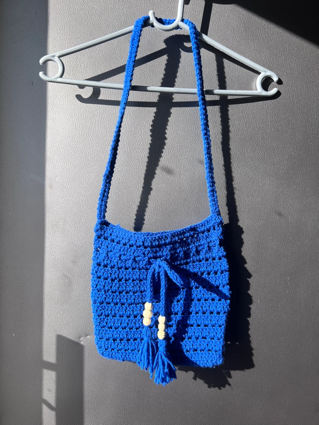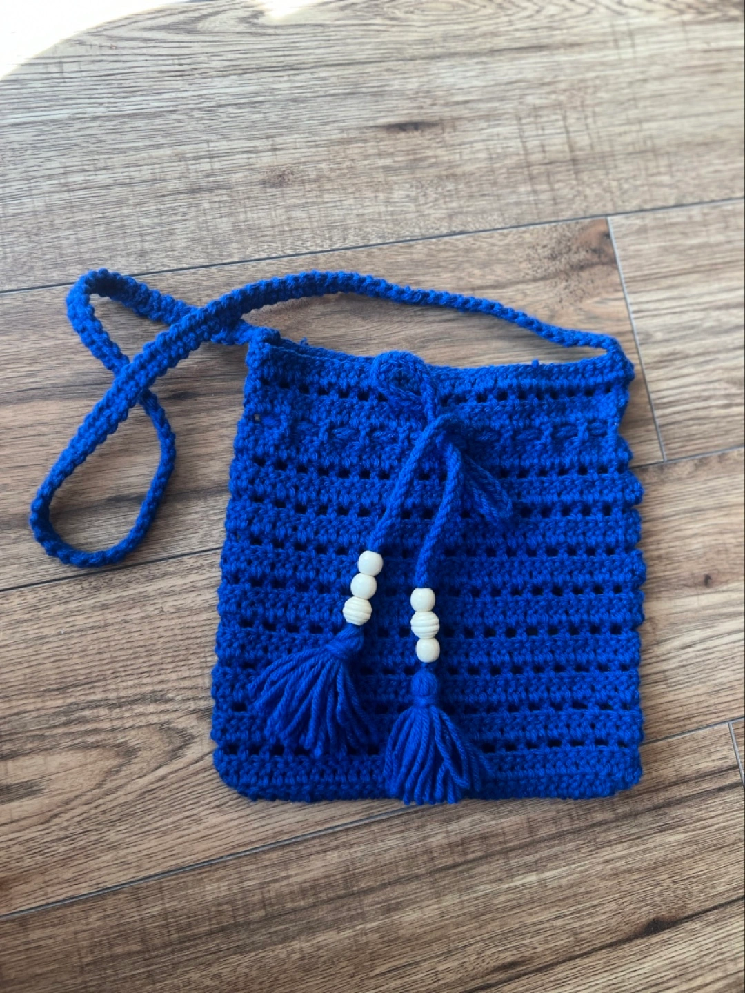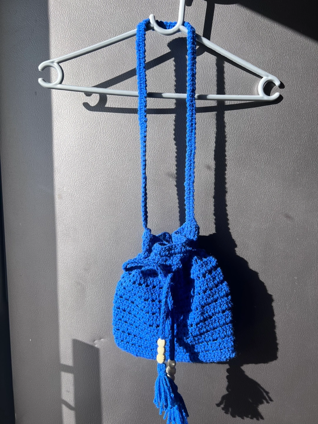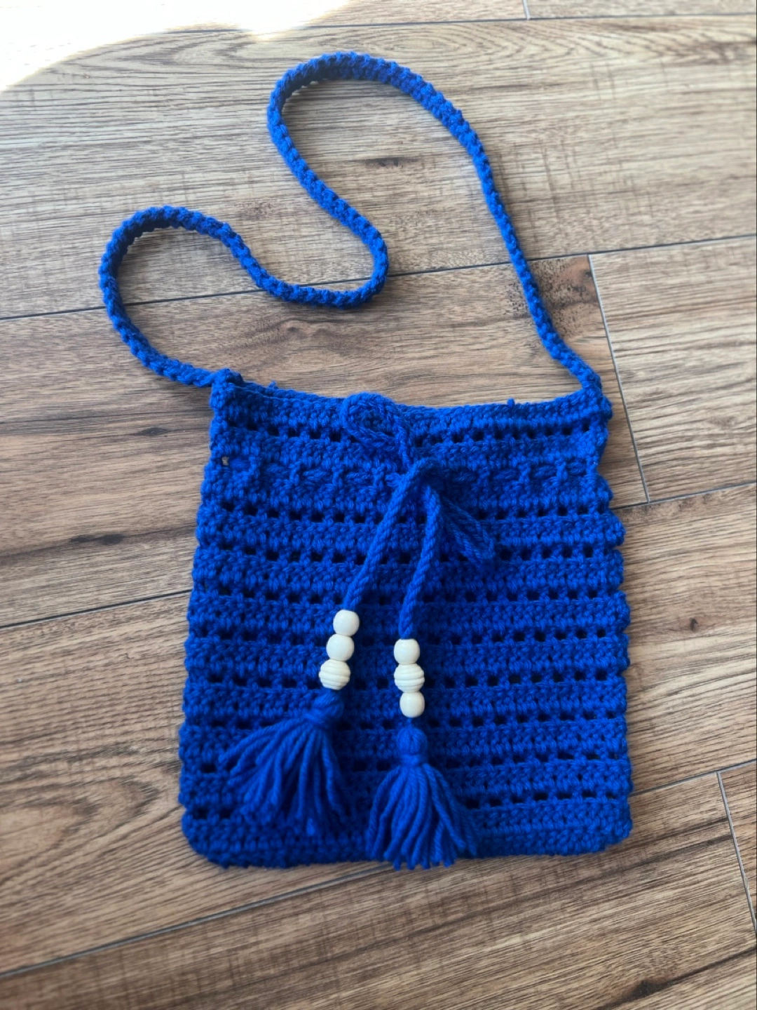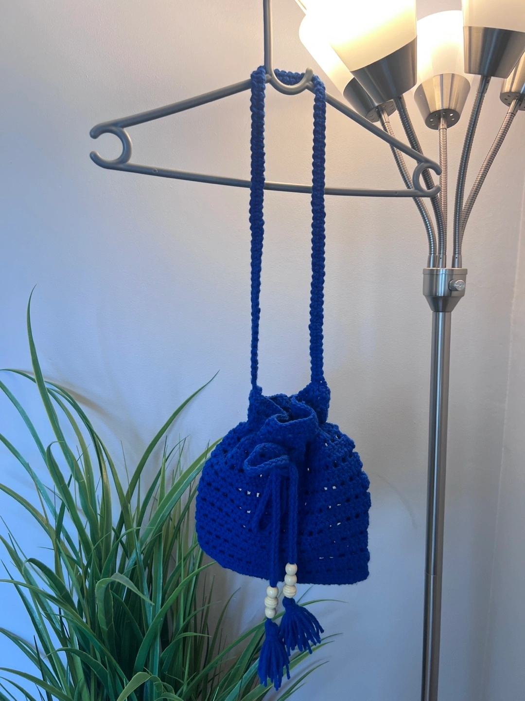 Adorable handmade crocheted crossbody bag. Features a vibrant royal blue colour, drawstring closure, and wooden bead accents. Perfect for summer outings.