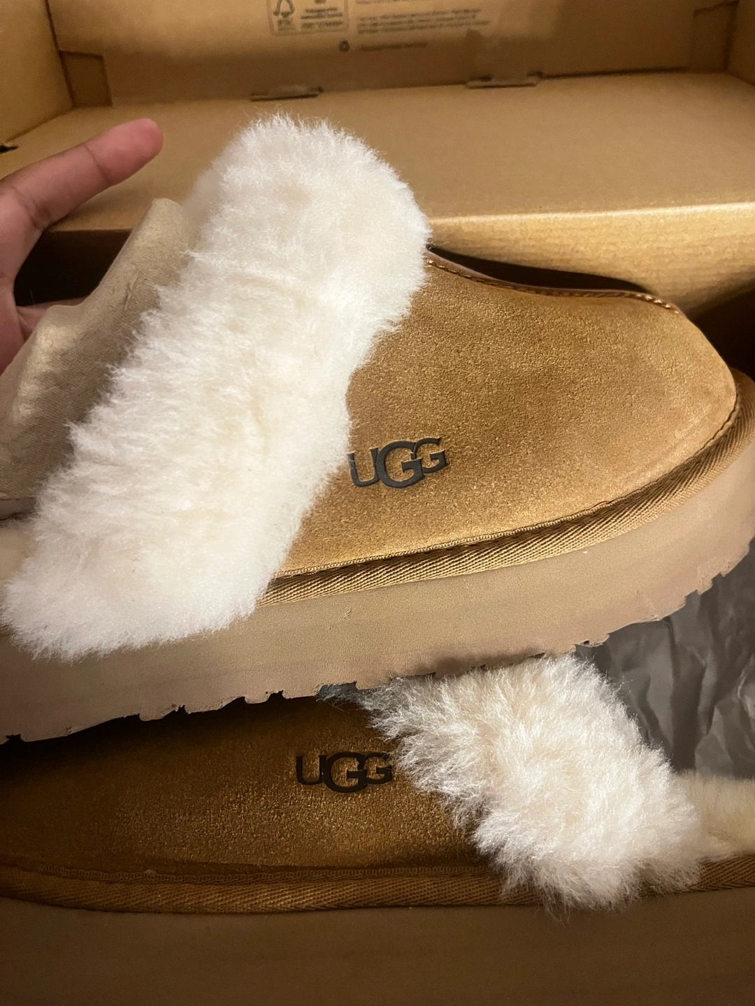 Cozy UGG slippers. Brown suede exterior. White shearling interior. Excellent condition. (Cash only)