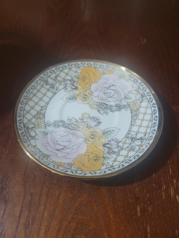 Here's a lovely tea cup and saucer set with a stand! The cups and saucers have a beautiful floral design with roses in yellow and lavender and gold accents, and a aluminum colored stand. The set is perfect for tea parties or just enjoying a quiet cup of tea. It includes a stand for easy storage and display. Never been used.