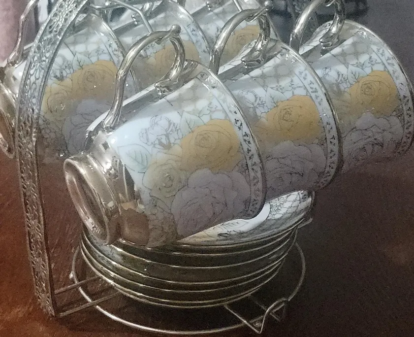 Here's a lovely tea cup and saucer set with a stand! The cups and saucers have a beautiful floral design with roses in yellow and lavender and gold accents, and a aluminum colored stand. The set is perfect for tea parties or just enjoying a quiet cup of tea. It includes a stand for easy storage and display. Never been used.