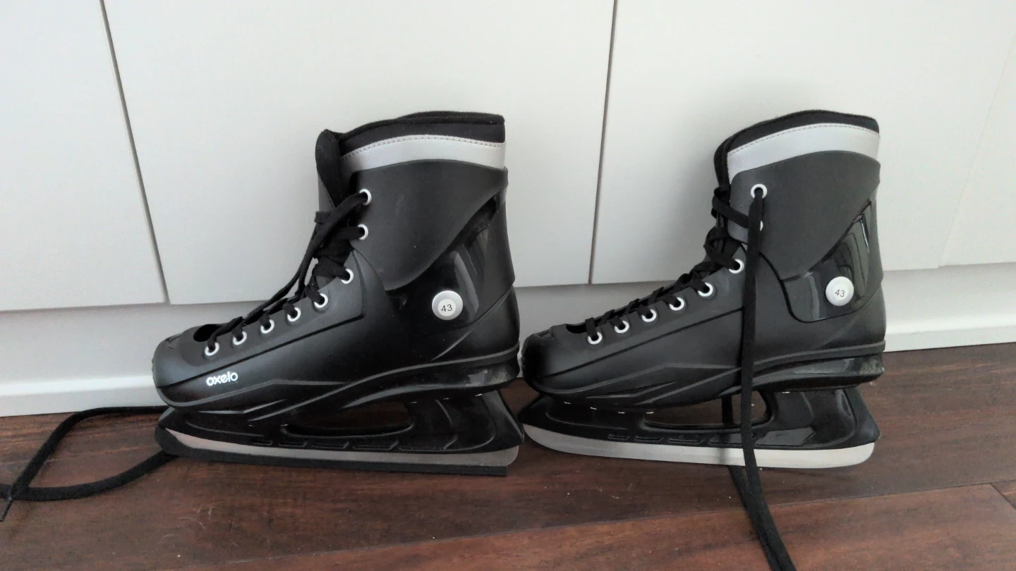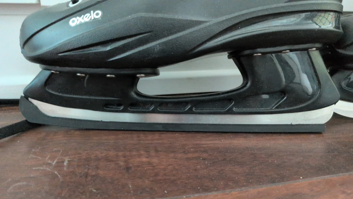 Black Oxelo ice skates in size 43. They feature metal blades and laces for a secure fit. Basically new, have only been used once or twice. In excellent condition.