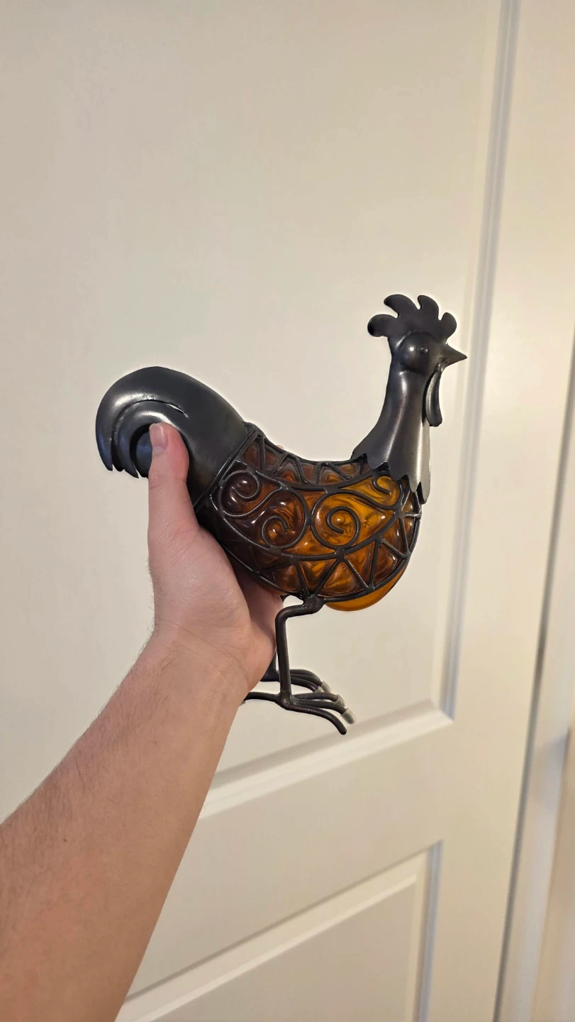 Decorative wine bottle holder shaped like a rooster. It features a dark metal frame with amber glass accents. This unique piece adds a rustic charm to any kitchen or dining area.
