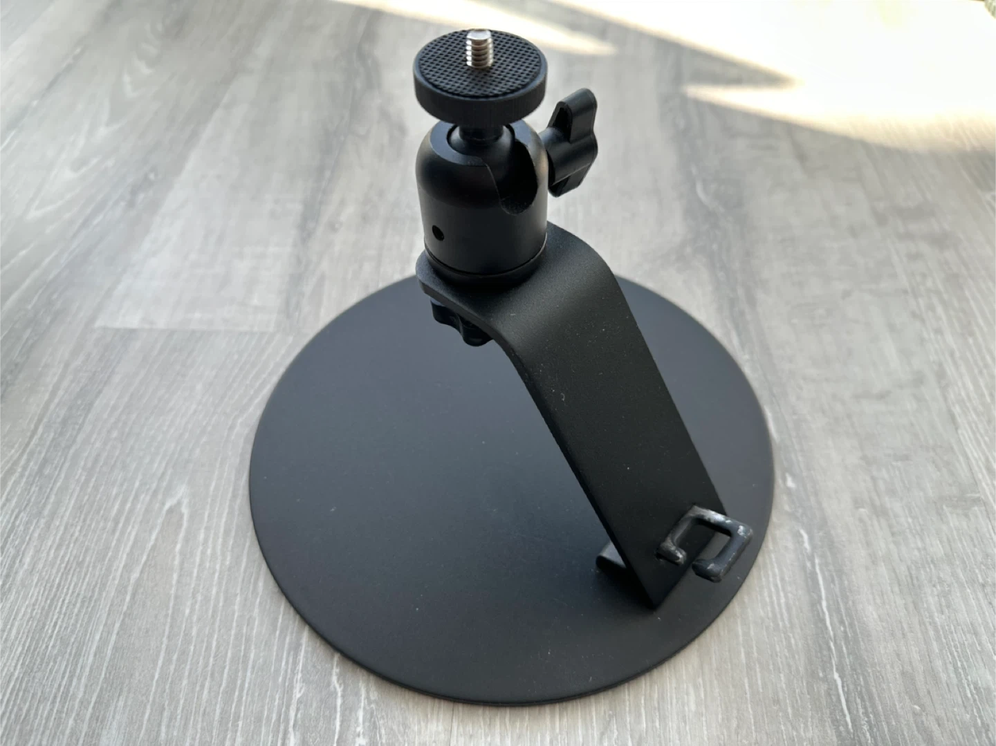 A sturdy black metal desktop mount for cameras or accessories. It features a ball head for adjustable positioning. Metal construction.