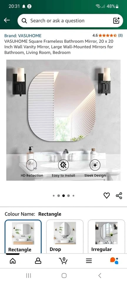 Vasuhome 20" x 20" Frameless Bathroom Mirror