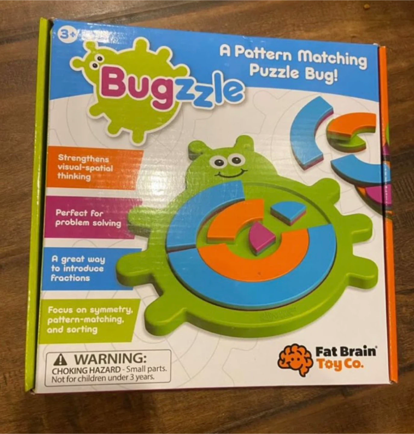 This Bugzzle toy is a fun pattern matching puzzle bug. It strengthens visual-spatial thinking, problem-solving, and introduces fractions. Recommended for ages 3-8, it includes 18 puzzle pieces and 40 pattern puzzles.