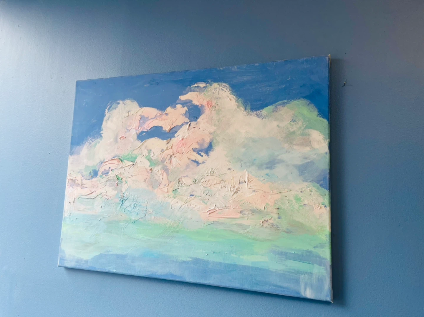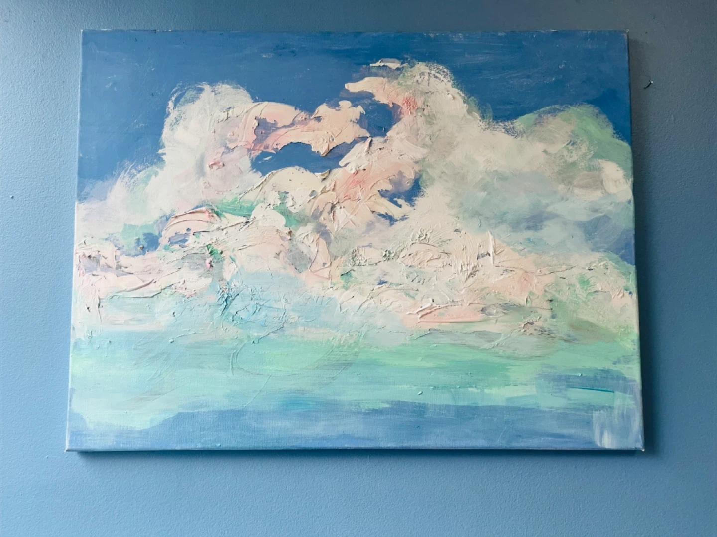 Canvas art featuring a textured, abstract painting of clouds. Vibrant blues, whites, and pastel pinks and greens. Oil or acrylic medium on canvas. 18 x 24 ”
