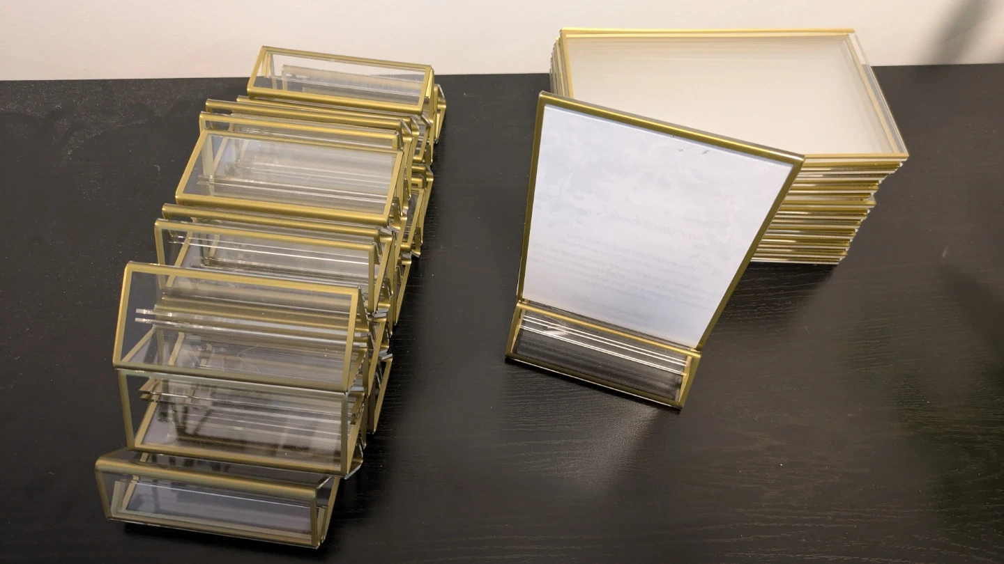 Selling a set of 21 gold table number holders. They are perfect for weddings, bridal or baby showers, parties, or other events where you need to dslisplay table numbers or names. We used them to display QR codes for our digital wedding photo guestbook.