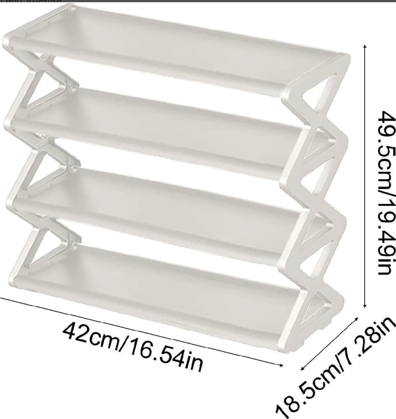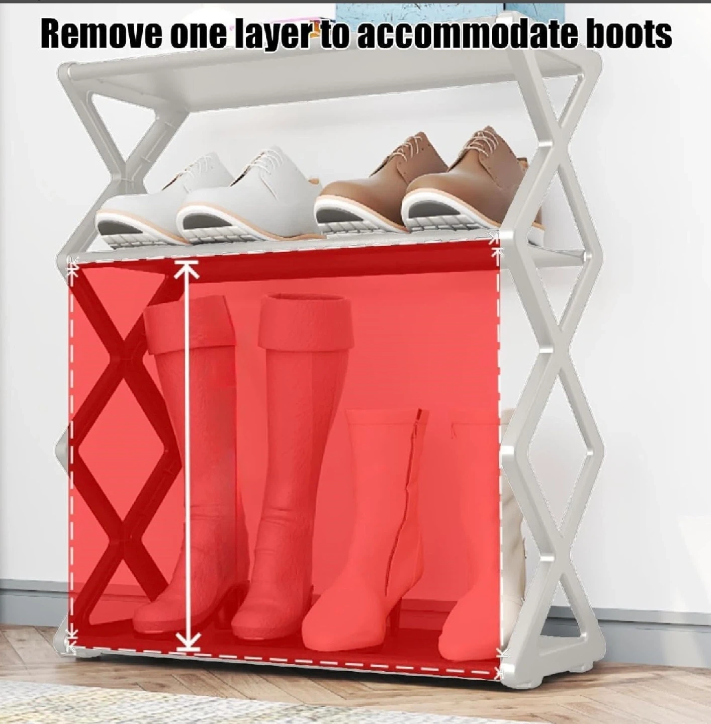 This is a 4-tier shoe rack, measuring 42cm wide, 18.5cm deep, and 49.5cm high. It's made of plastic and can accommodate boots by removing a layer. This organizer is useful for keeping hallways and closets tidy.