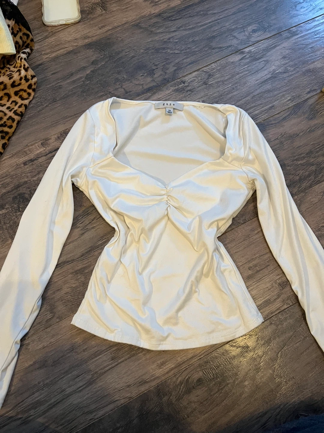 White Gaze long sleeve in size xs. It has a very stretchy and breathable material, so it’s perfect for everyday wear. It’s not stained, damaged, or worn out. Comes from a smoke free and pet free home