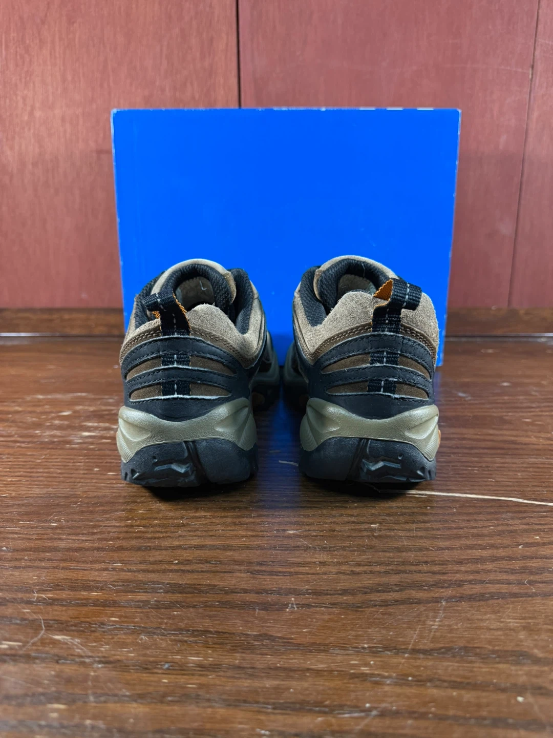 The shoes feature a durable brown upper, providing excellent support and protection for outdoor adventures.