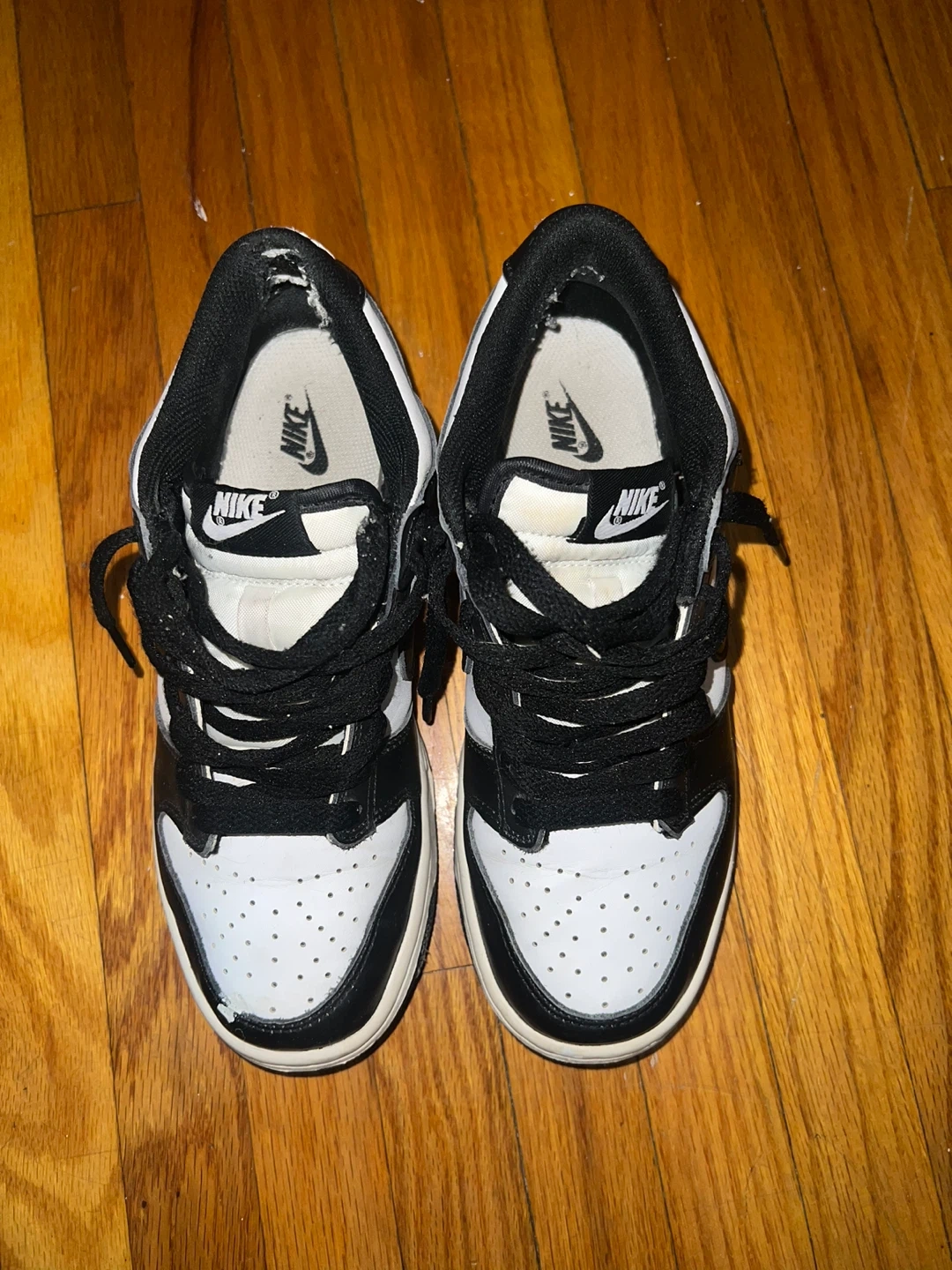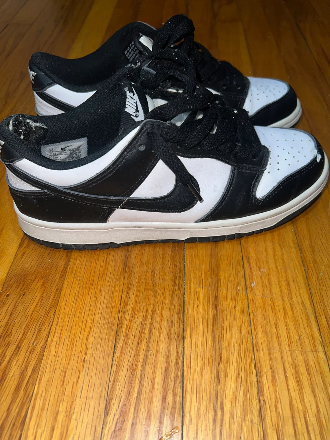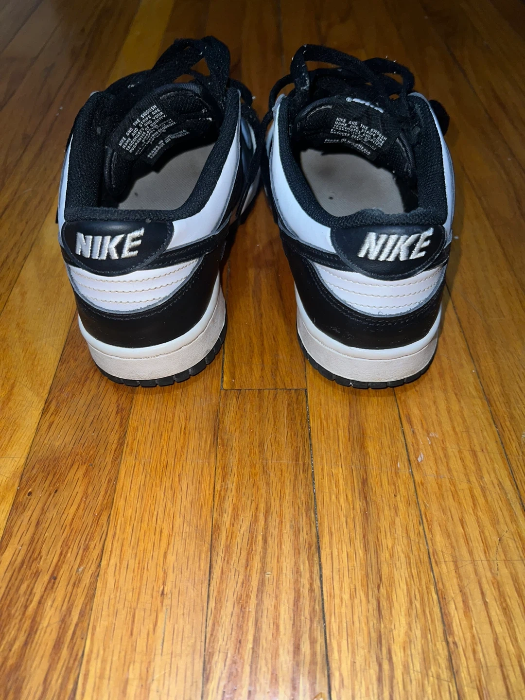 A pair of Nike Dunk Low sneakers in a classic black and white colourway. These shoes are made with a leather upper and rubber sole for durability. Perfect for everyday wear!